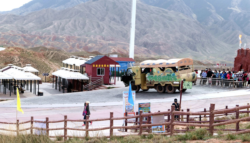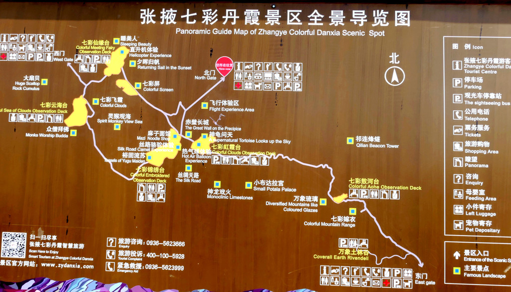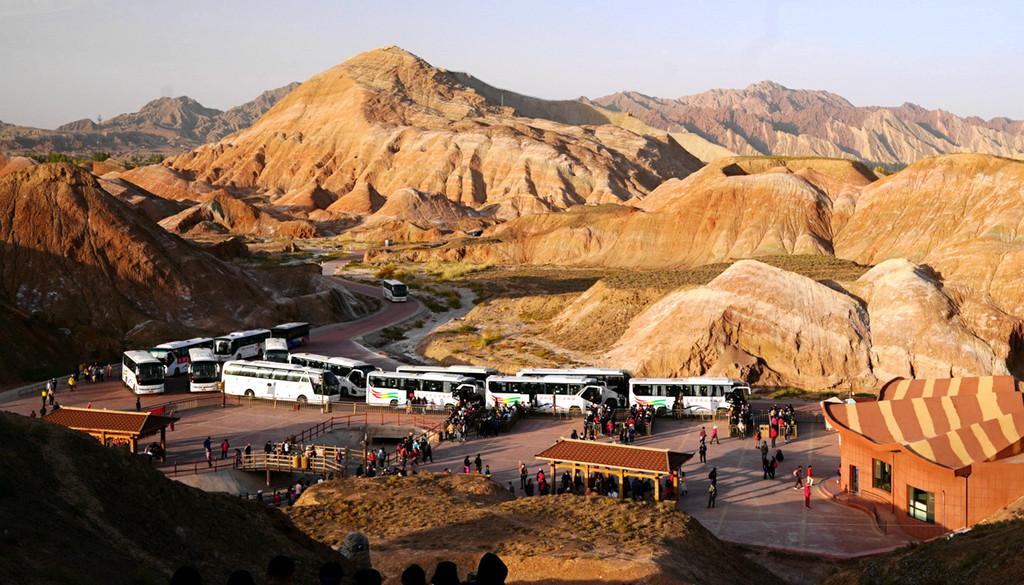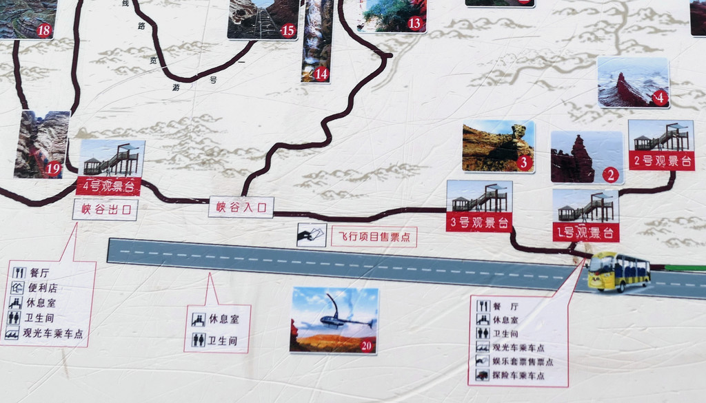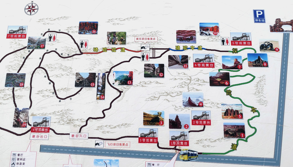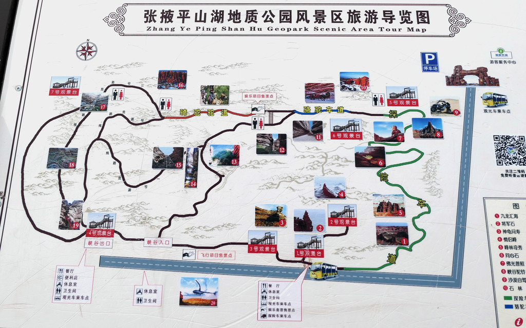 根据停车场路边的“张掖七彩丹霞景区全景导览图”可知:景区共有北、东、西三处入口,游客须将自驾车存放门外停车场,然后搭乘景区交通车进入景区。景区内配备专用游览车,按照顺时针方向,沿环形公路绕行景区核心地域。全程共设4 站,也就是四座观景台,游览车是按照公交车的方式运行,每站都停,游客随意上、下,游览过一处景点后可以再次登车,前往下一站。导览图对于从不同入口进入景区的游客也指明了不同的乘车游览顺序: