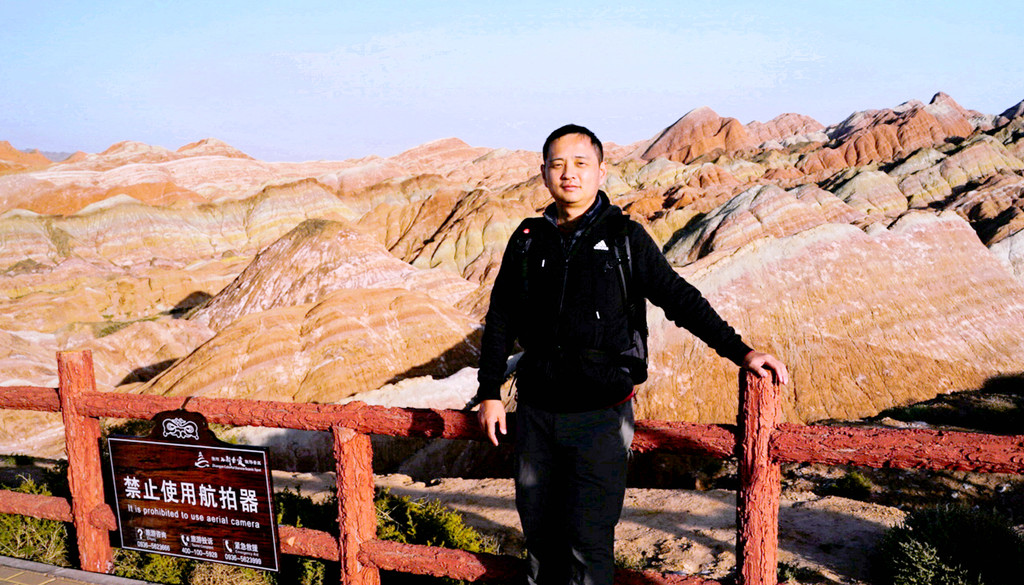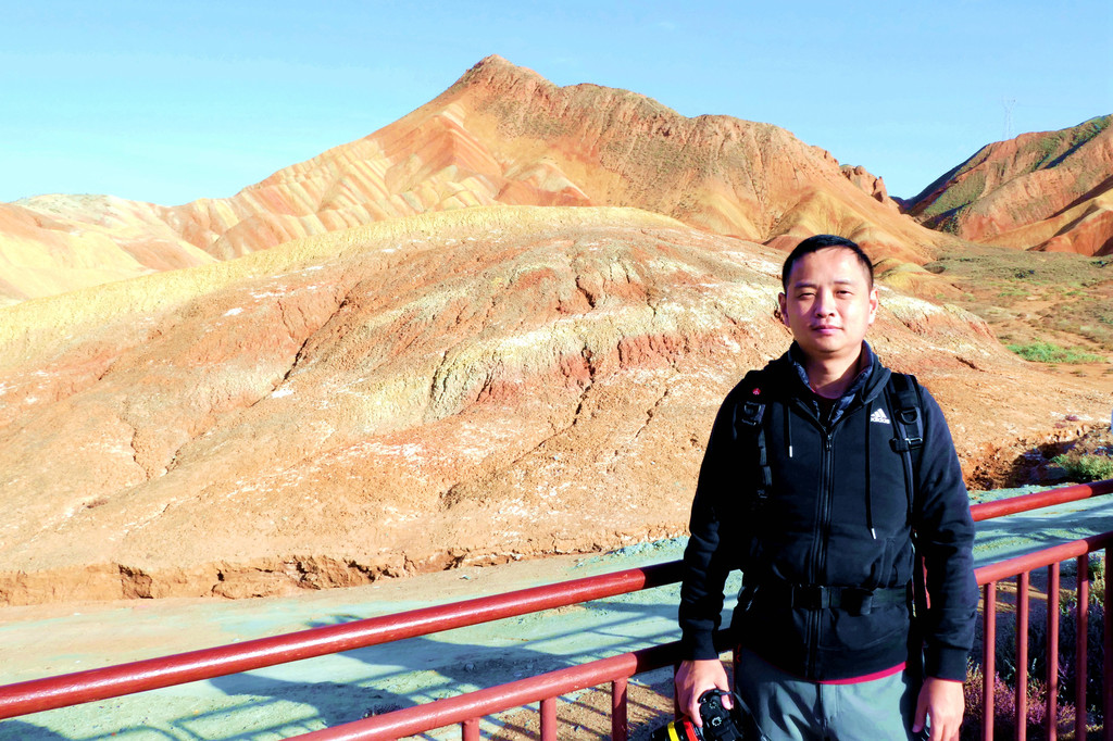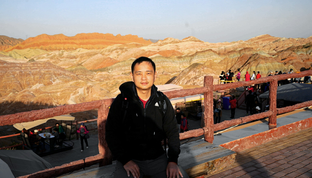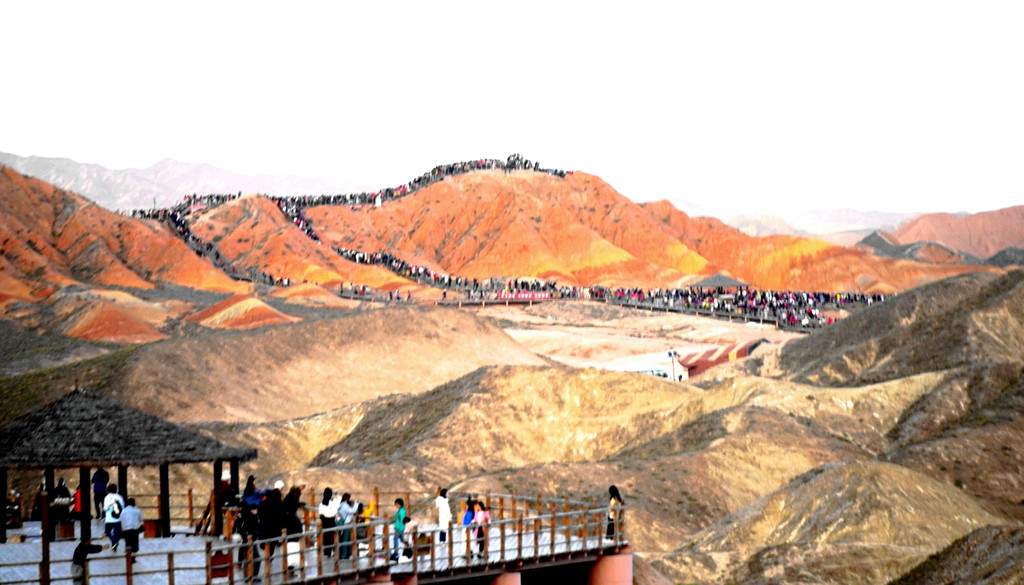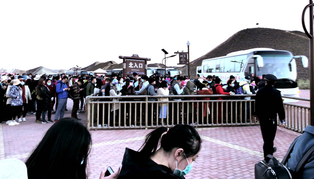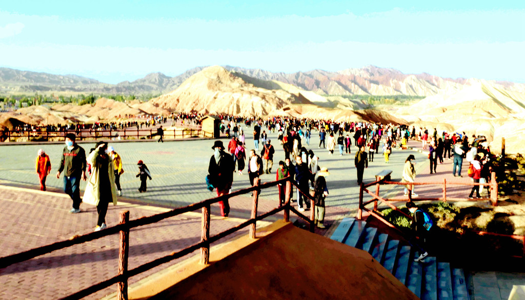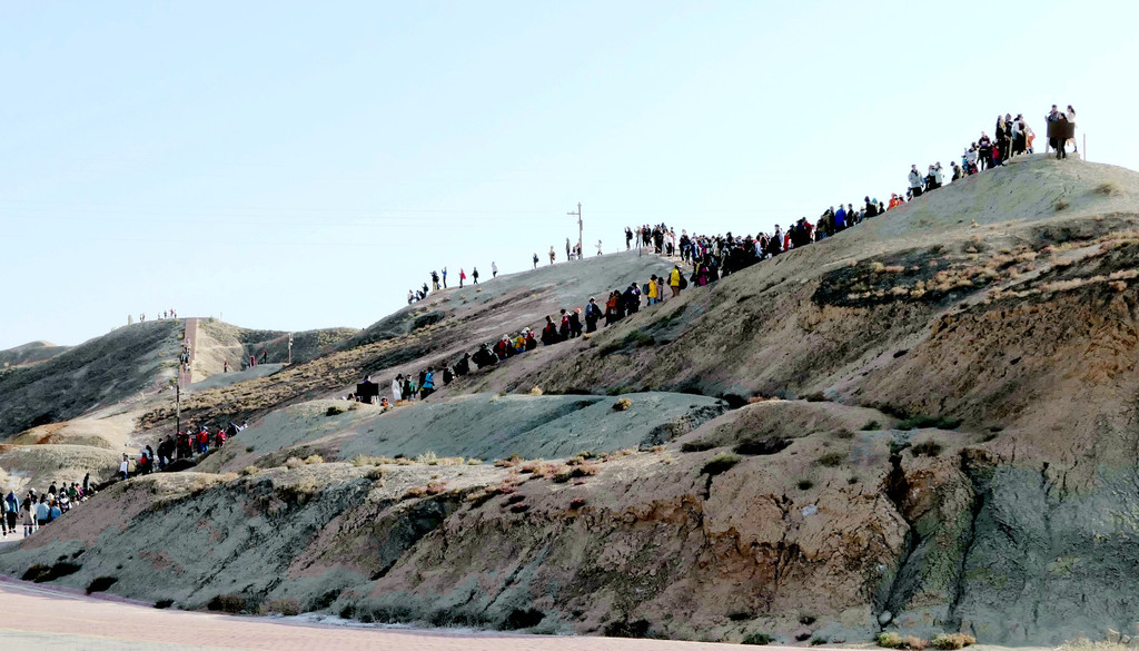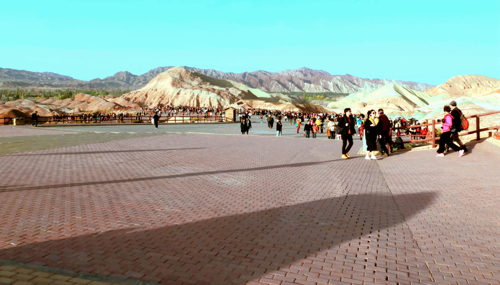从北门搭乘景区交通车,16:40抵达“七彩仙缘台”。2008年我亦曾来过此处,当年的丹霞景区是分为“公营”与“私营”两块地域,“仙缘台”所在地域属私人老板经营,我是包租一部的士,付给老板10元“买路钱”,然后就直接驶入景区。当年这里非常荒凉,只有一条简易土路,其他啥都没有,在我逗留期间,整个景区内就只有三位游客,两部出租车。现在是将“公”、“私”两块地域合并成为“张掖七彩丹霞景区”,交由一家公司统一经营。七彩仙缘台作为我2008年曾光顾过的地方,它也是我们今日进入景区后停留的第一站,十二年的光阴流逝,“张掖七彩丹霞”也是知名度大增,国庆长假虽然已近尾声,但“仙缘”台上依旧人山人海,让我着实有点儿始料未及。