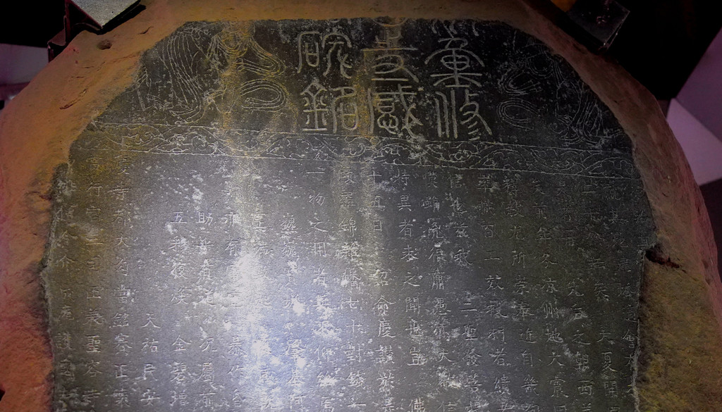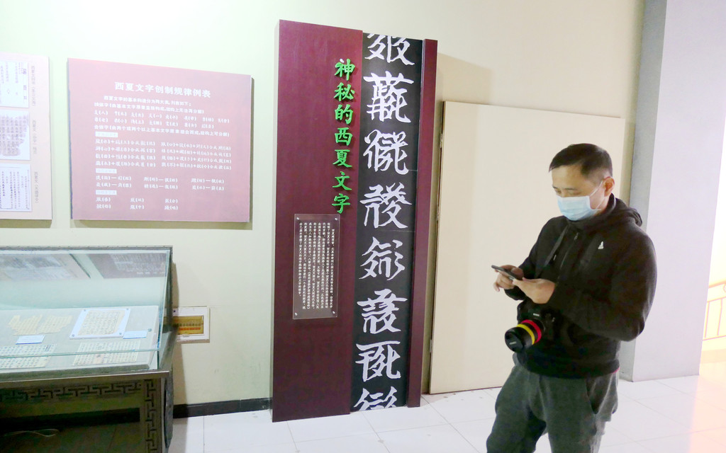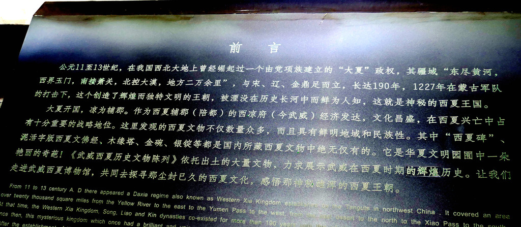 15:15抵达西夏博物馆,此处停车很方便,博物门前就有停车场(收费)。该博物馆主要是利用浮雕、文物、图片与壁画的方式,向观众介绍西夏古国在政治、经济、军事、文化等领域所取得之成就。其中,最著名的展品就是那座“西夏碑”,正式名称《凉州重修护国寺感通塔碑铭》。它是全国保存最完整、西夏文与汉文对照最多的一块石碑,曾为破译神秘、古怪的西夏文字做出过重要的贡献,属全国重点文物保护单位。