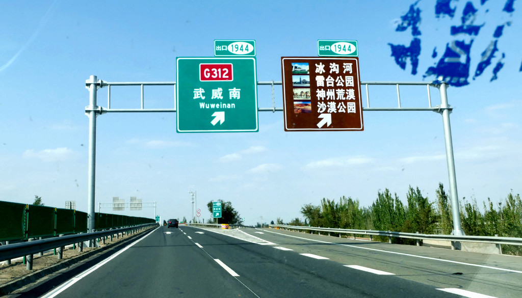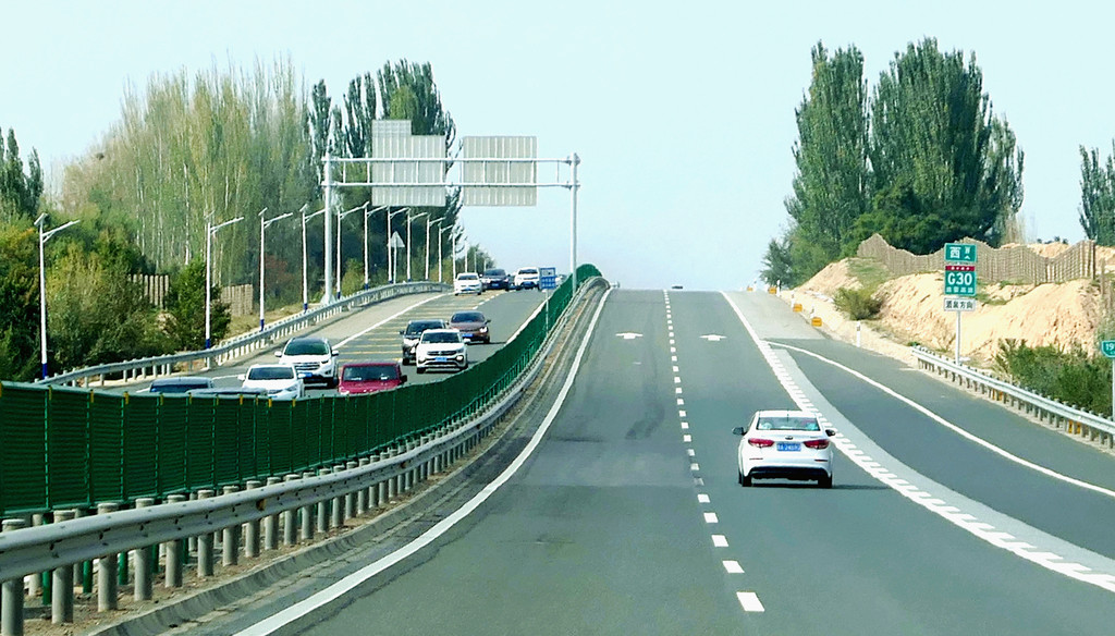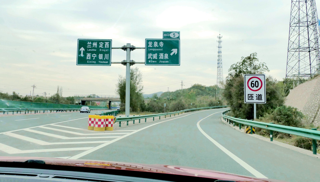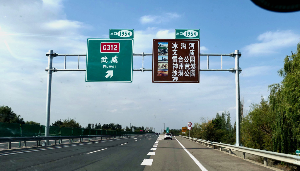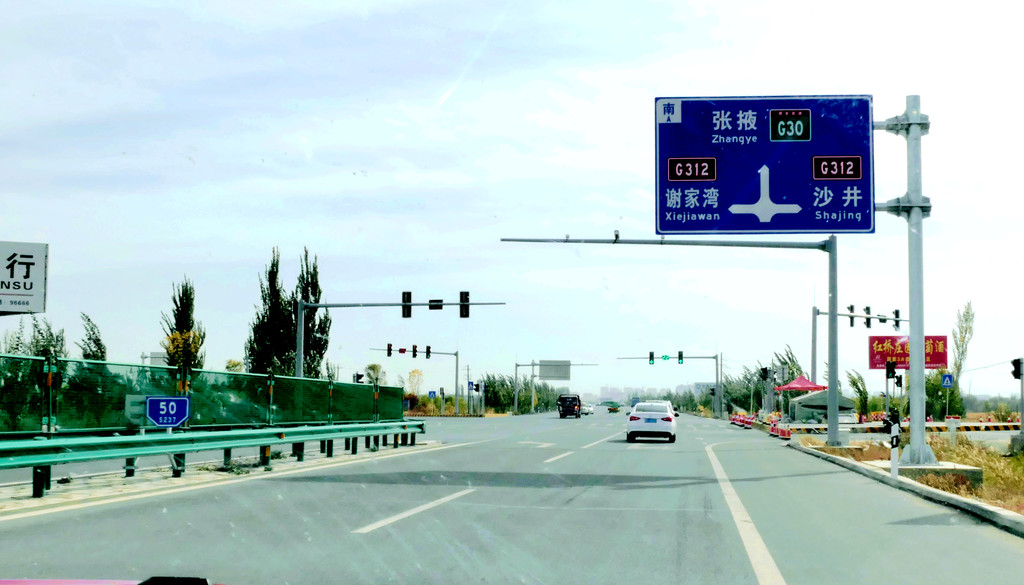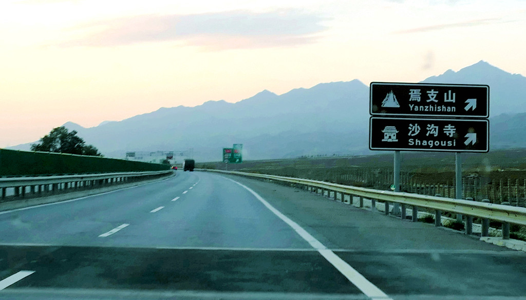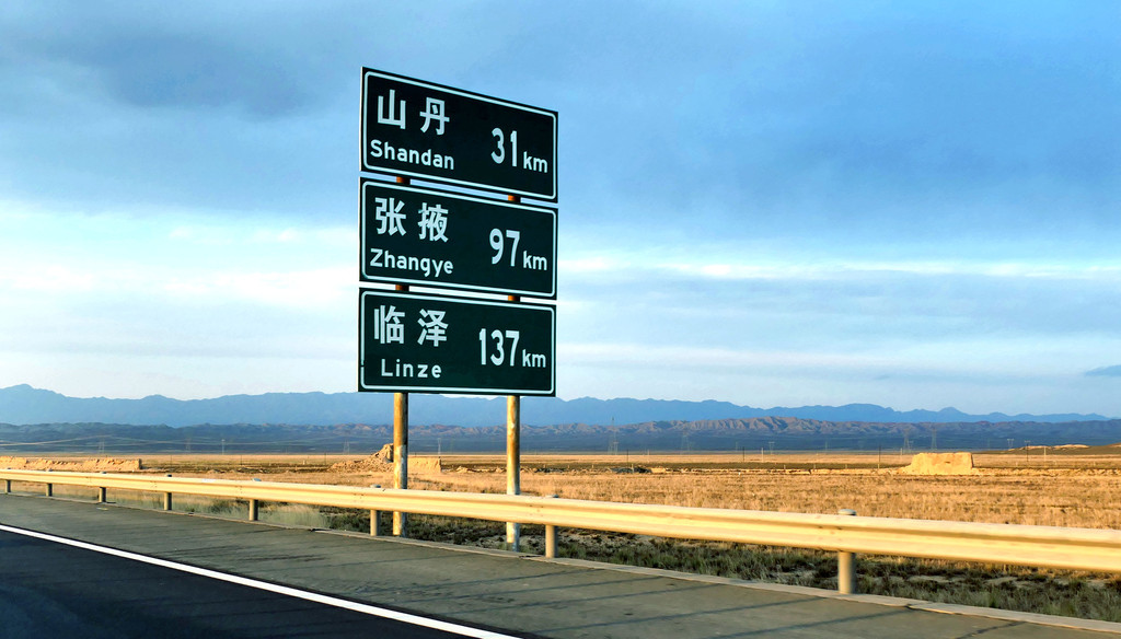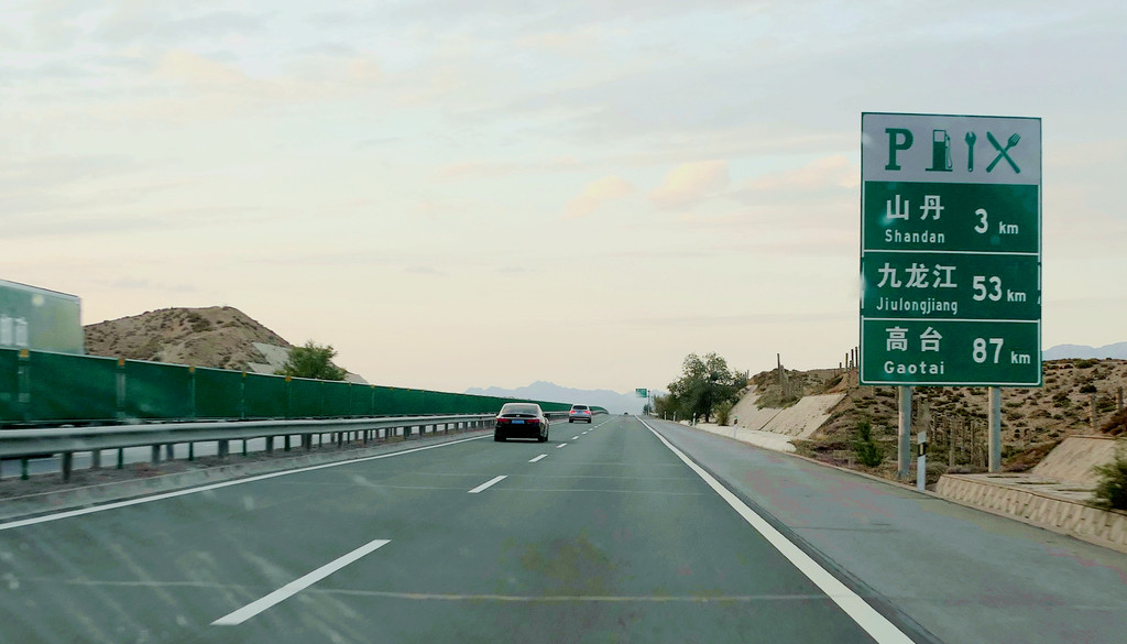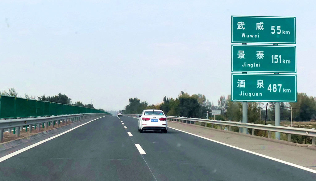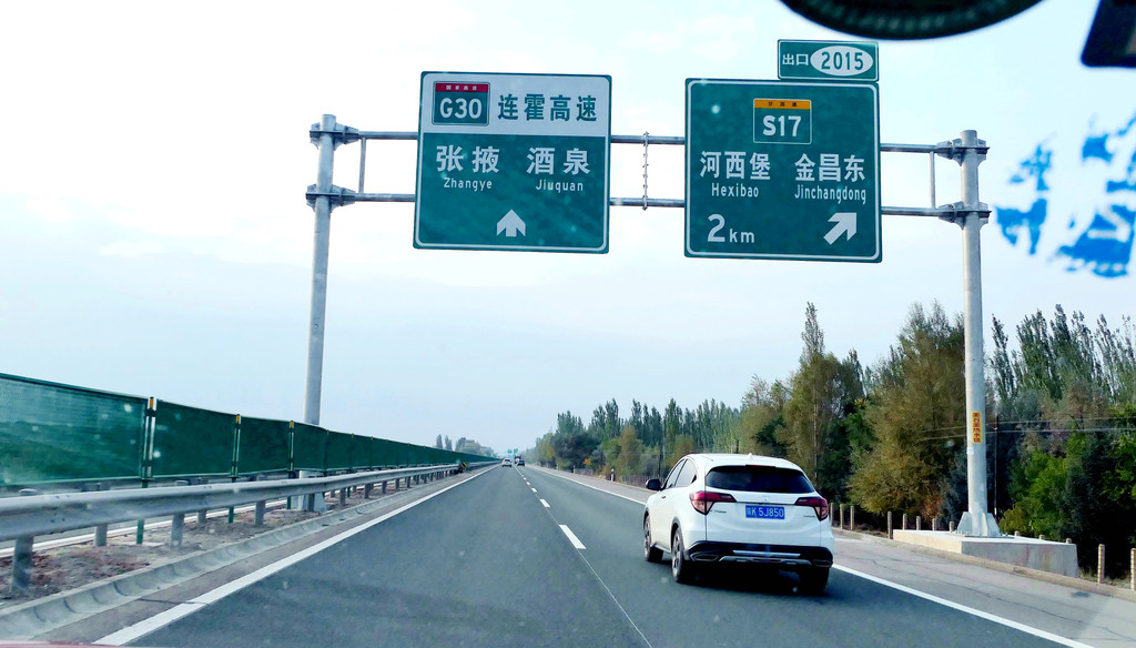 提车时油箱内几乎没油,出发前临时加油115元。12:12在中川收费站上高速,12:37经茅茨岘枢纽进入G30连霍高速,向西行驶,开始我们穿越河西走廊之旅,国庆假日高速免费。河西走廊呈东南-西北走向,东起乌鞘岭,西至古玉门关,总长近1000公里,地跨甘肃省的河西五市:武威、张掖、金昌、酒泉和嘉峪关,其中,除金昌外,其他四座城市都是我们此行所要经过之地。再就地势而言,河西走廊是被两道大山所挟持的长条状堆积平原,其南侧有祁连山、阿尔金山,北侧是马鬃山、合黎山和龙首山,“走廊”宽数公里至百多公里不等,因为是地处黄河以西,故称“河西走廊”。