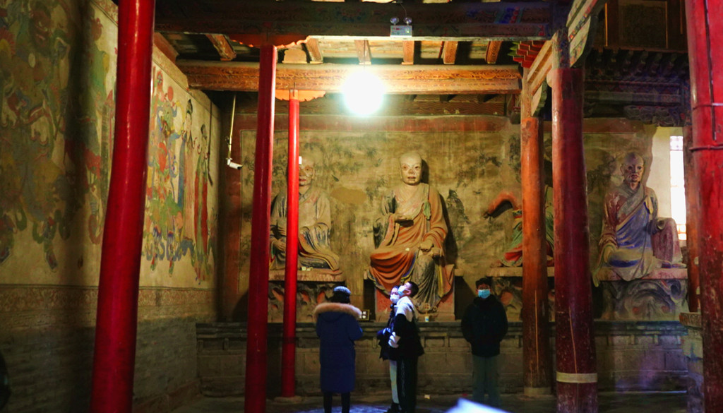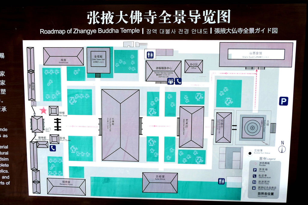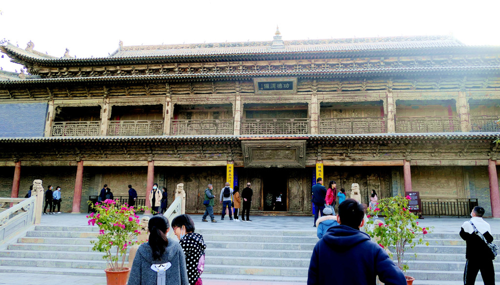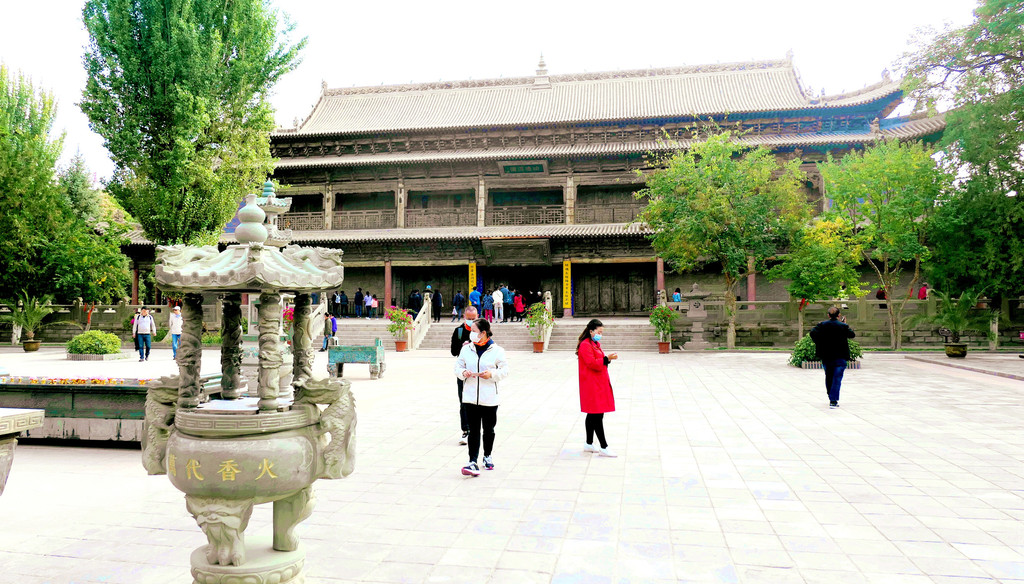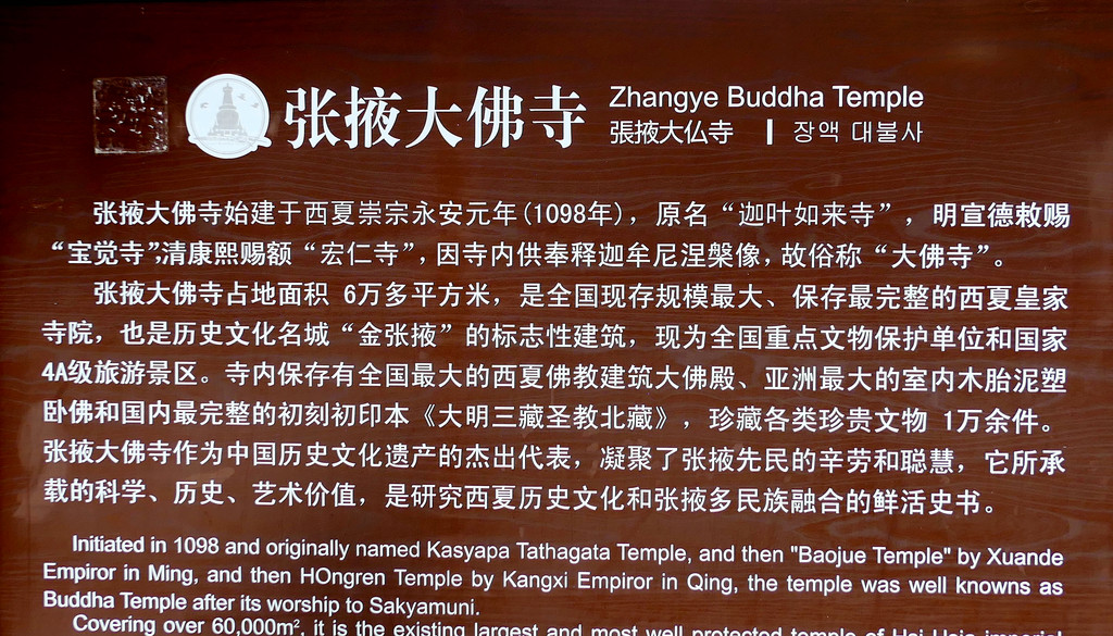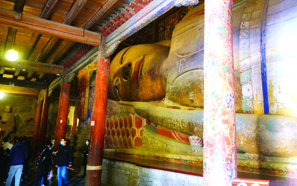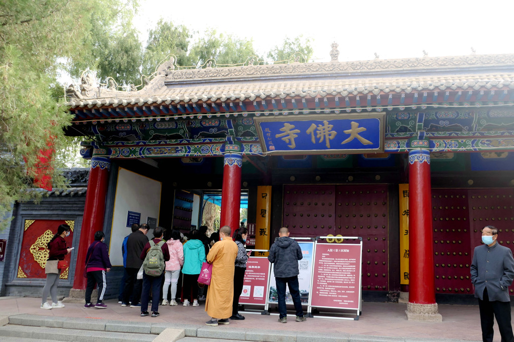 大佛寺门票40元/人,70岁以上免票,实名购票、登记,凭借身份证刷脸进寺。这是一座我国现存规模最大、保存最完整的西夏皇家寺院,原名“迦叶如来寺”,明朝改称“宝觉寺”,清朝又称“宏仁寺”,但因寺内有尊巨大的释迦牟尼涅槃塑像,民间俗称其为“大佛寺”。我们今日时间不多,主要就是看了看寺内的大佛殿,2008年我曾来过这里,但当时大佛殿正在维修,未能看到著名的大佛,今日总算如愿以偿。大佛塑像身长34.5米,是亚洲最大的室内木胎泥塑卧佛。大佛殿维修工程的“修旧如旧”风格也让我印象颇深,它不像河北省的赵州桥,维修以后就完全变成一座新桥,让人感觉好似现代仿古建筑。