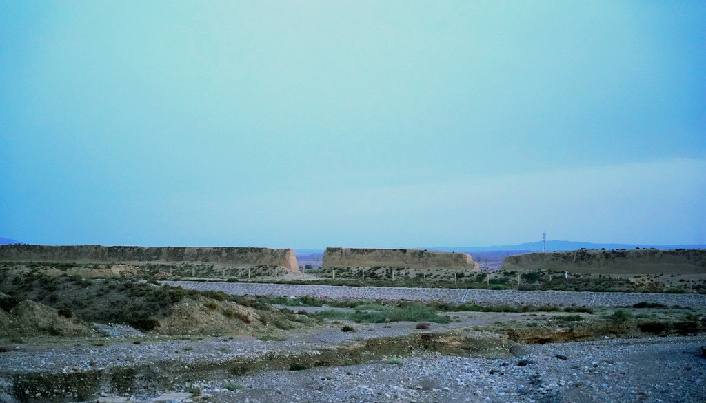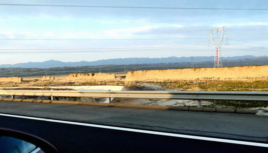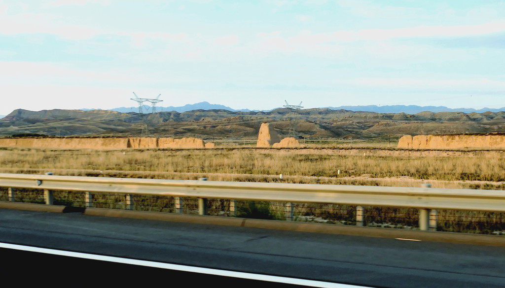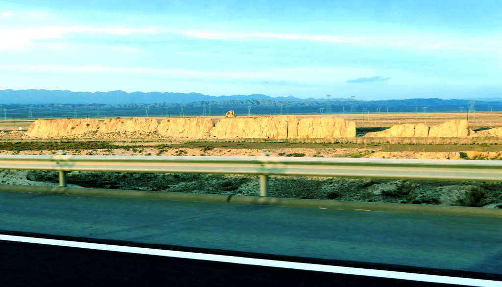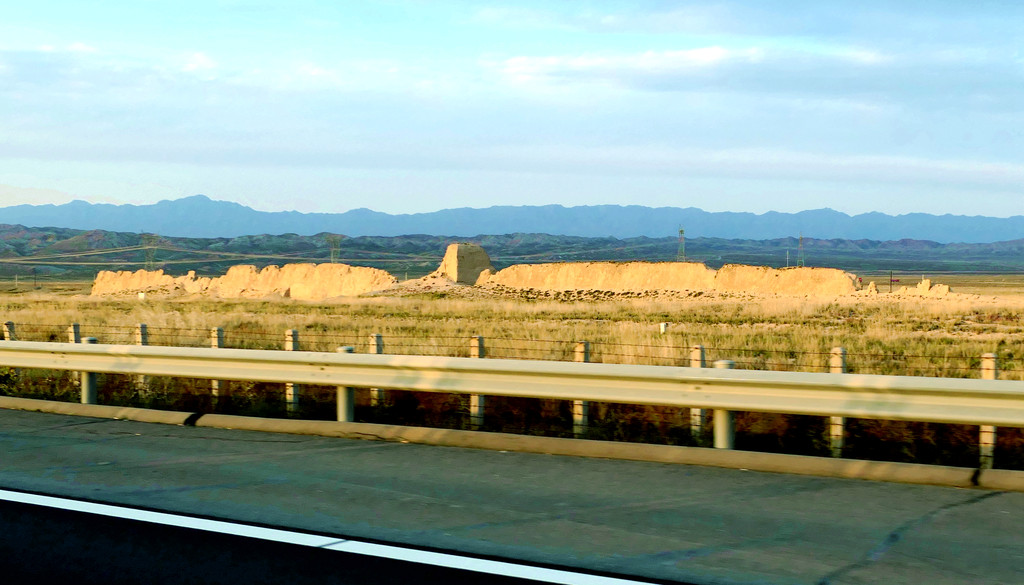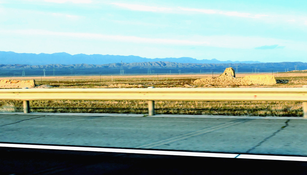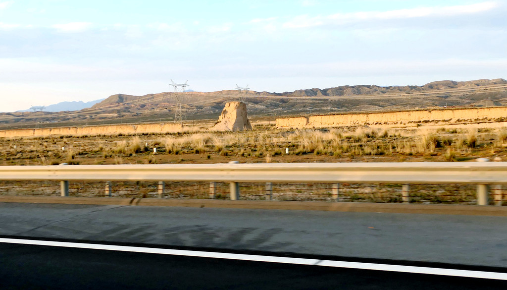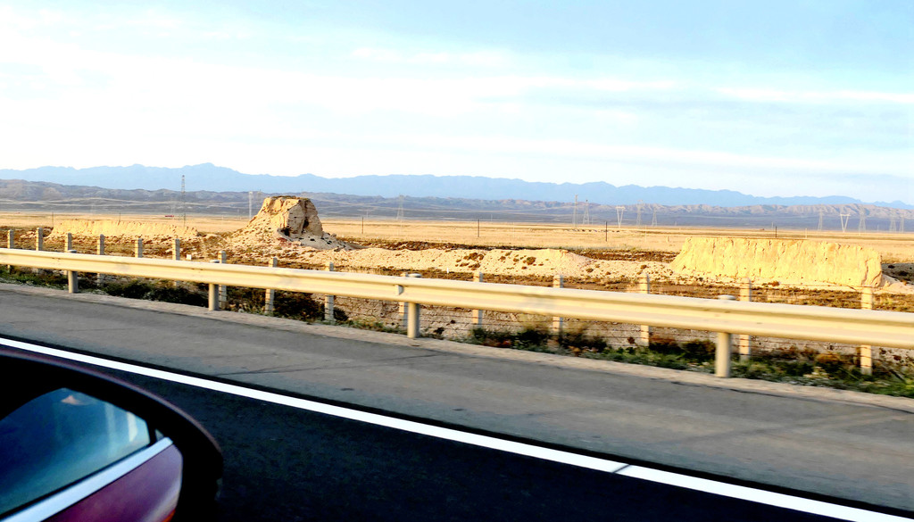 不久后,右侧远处的荒野中开始有一个、又一个的土疙瘩、土堆现身,它们互不相连,排列成串,持续地伴随着连霍高速向前延申,那就是古代长城的遗迹。我们继续西行,长城慢慢地朝向公路靠拢,同时也越来越有了“墙”的模样。18:23看到路边耸立一座高大的城堡,公路穿越长城而过,长城也随之从我们的右侧转移到了左侧。此刻正是夕阳西下,大地一片金黄。