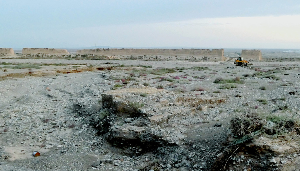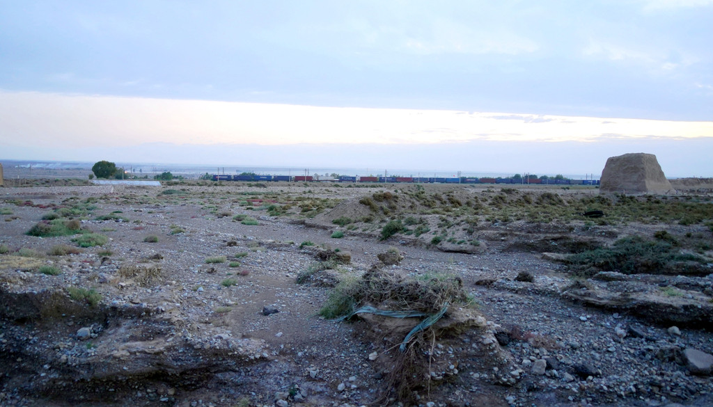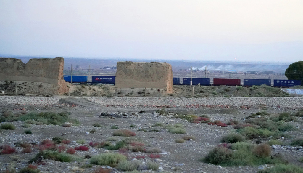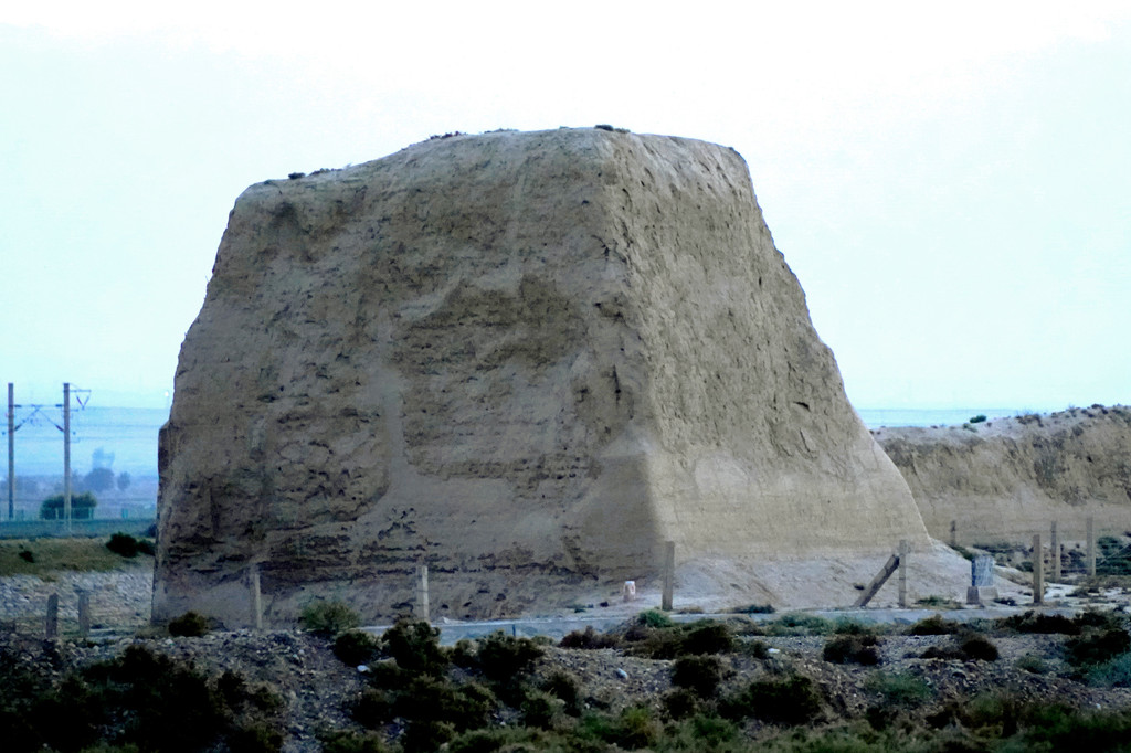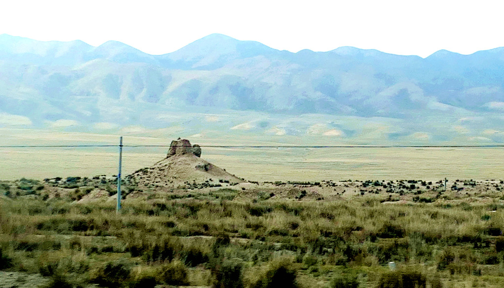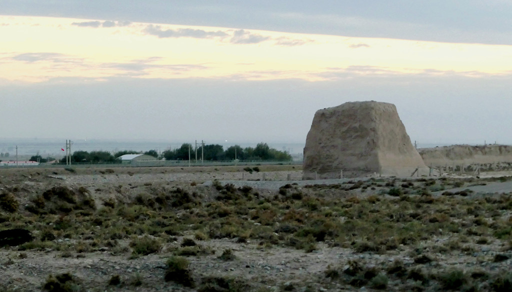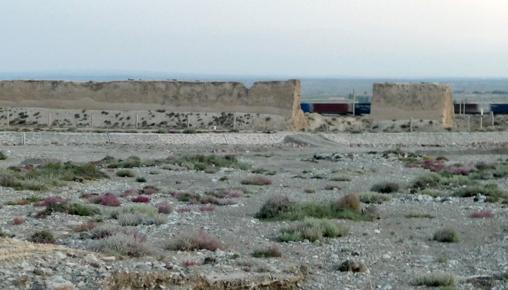不久后,右侧远处的荒野中开始有一个、又一个的土疙瘩、土堆现身,它们互不相连,排列成串,持续地伴随着连霍高速向前延申,那就是古代长城的遗迹。我们继续西行,长城慢慢地朝向公路靠拢,同时也越来越有了“墙”的模样。18:23看到路边耸立一座高大的城堡,公路穿越长城而过,长城也随之从我们的右侧转移到了左侧。此刻正是夕阳西下,大地一片金黄。