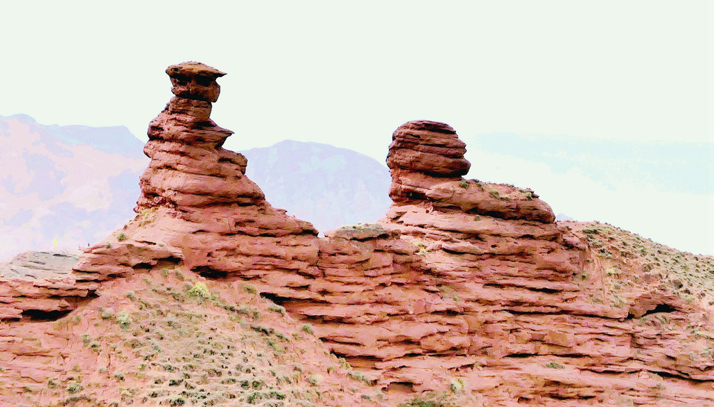 站在二号观景台上眺望,眼前是一望无际的丘陵、土埂,高低起伏,气势磅礴,给人的感觉就好像是波涛汹涌的大海。更有一座“情侣峰”,造型好似热恋中的情侣相拥海边礁岩,正在眺望着浪花滚滚的大海。据说,在全国现有的多处情侣峰中,唯有平山湖的这对“情侣”最为传神。