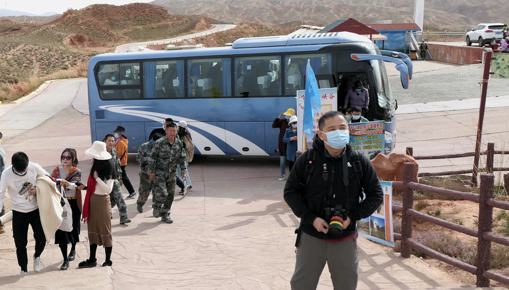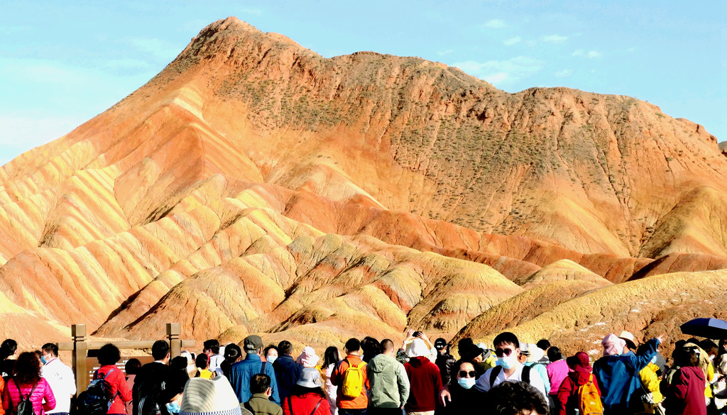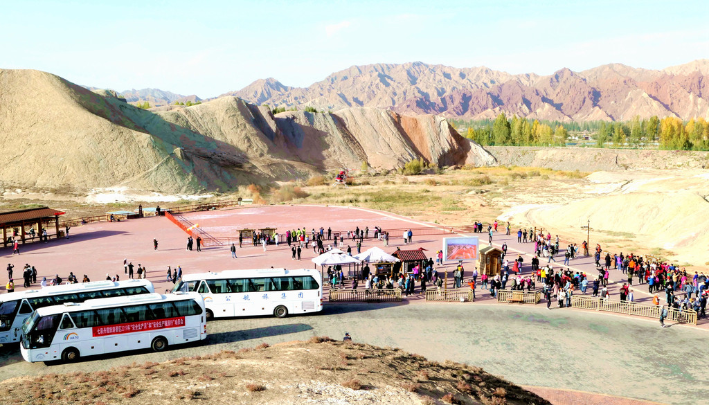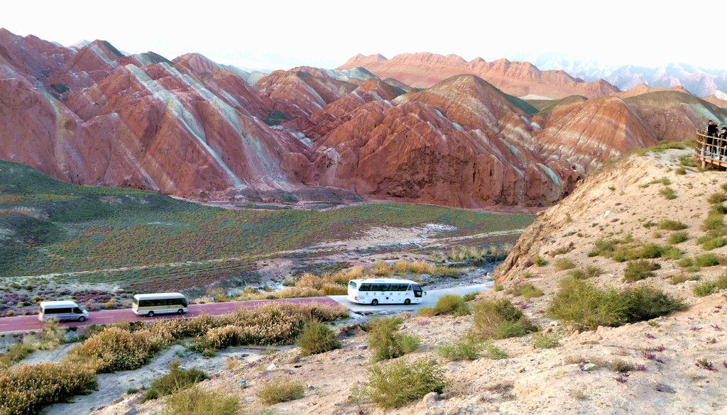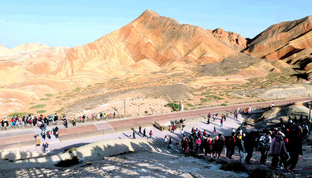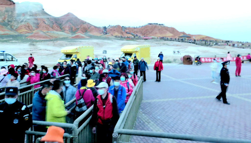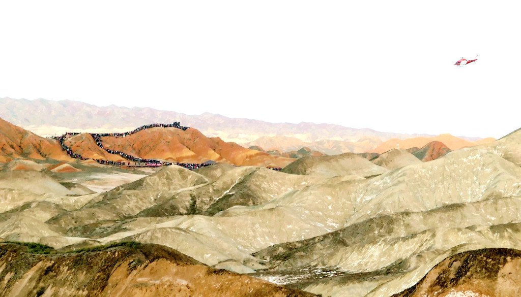 站在这里向东眺望,可以看到景区游览车的下一处停靠景点“七彩虹霞台”,整座山头密密麻麻站满了人。国庆假日已近尾声,而且还是疫情期间,张掖七彩丹霞依旧是如此爆满,再一次让我深感意外。七彩虹霞台附近建有直升机起降坪,两架观光直升机轮番起降,生意也是极好。