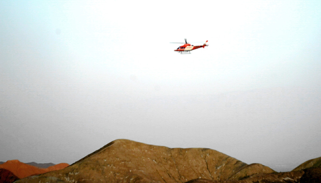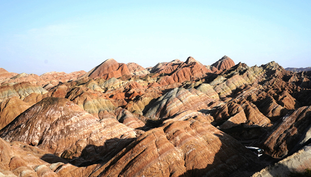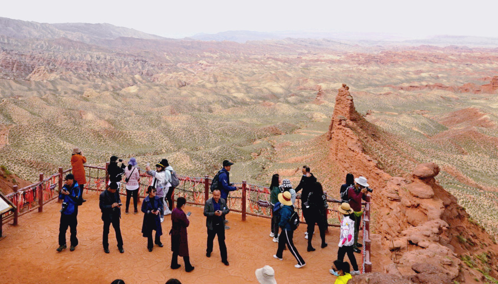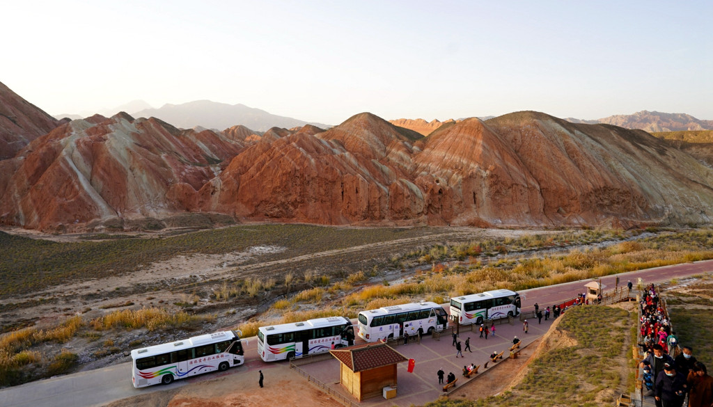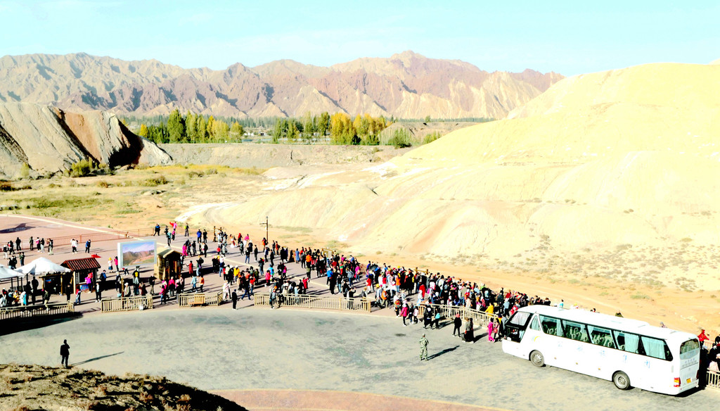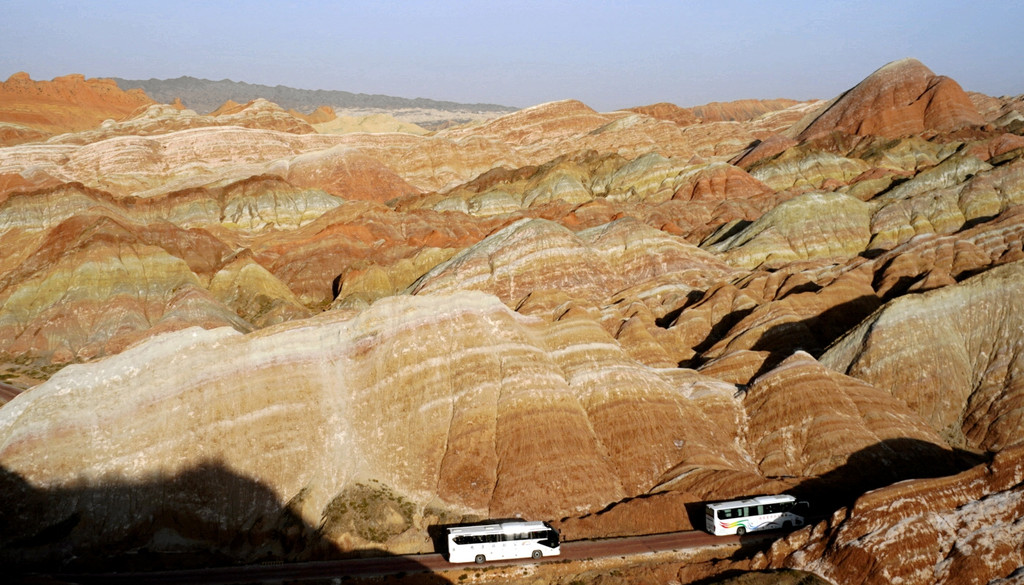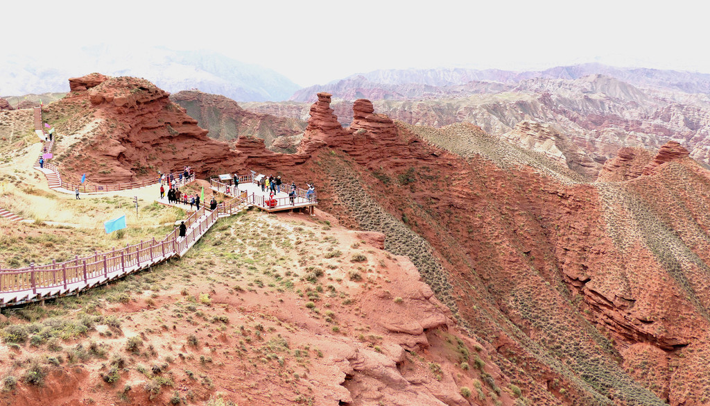 站在这里向东眺望,可以看到景区游览车的下一处停靠景点“七彩虹霞台”,整座山头密密麻麻站满了人。国庆假日已近尾声,而且还是疫情期间,张掖七彩丹霞依旧是如此爆满,再一次让我深感意外。七彩虹霞台附近建有直升机起降坪,两架观光直升机轮番起降,生意也是极好。