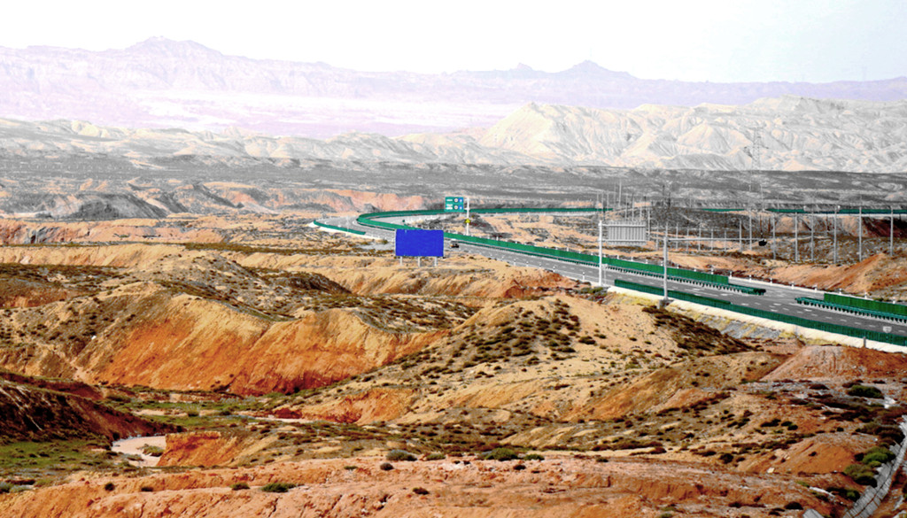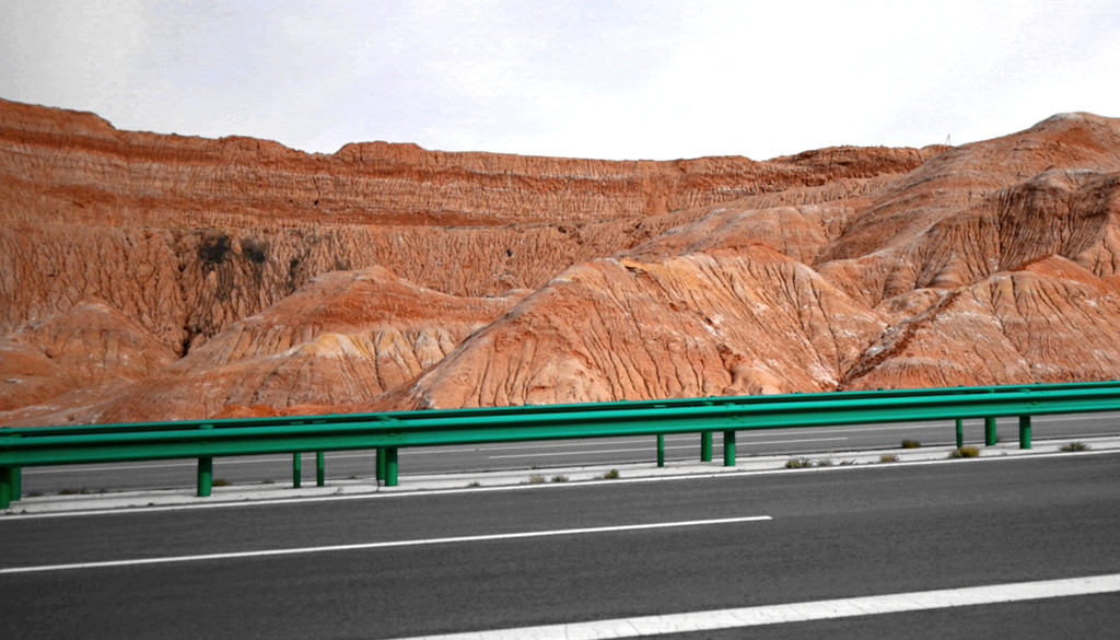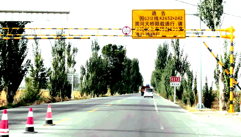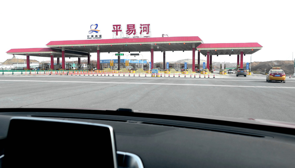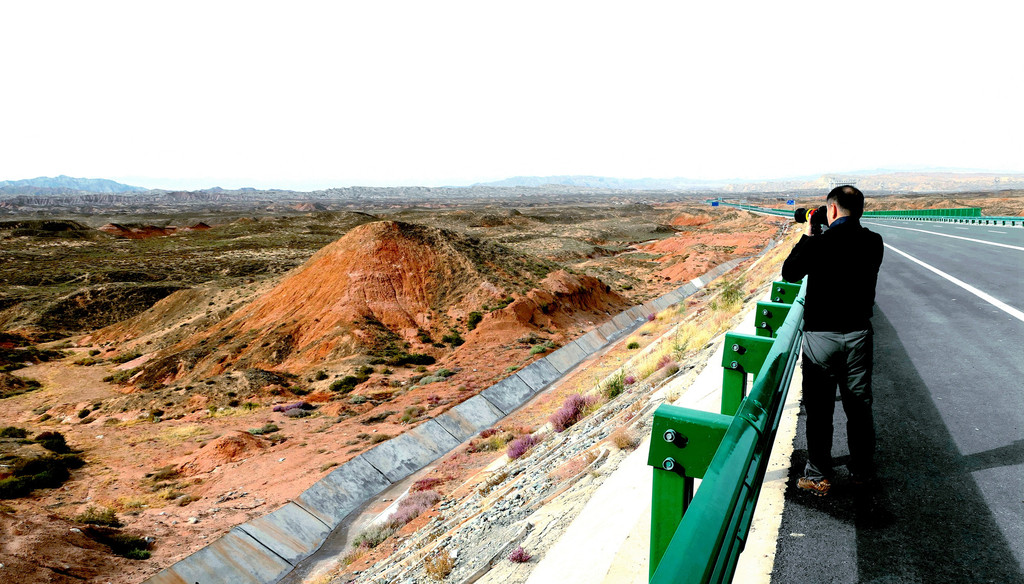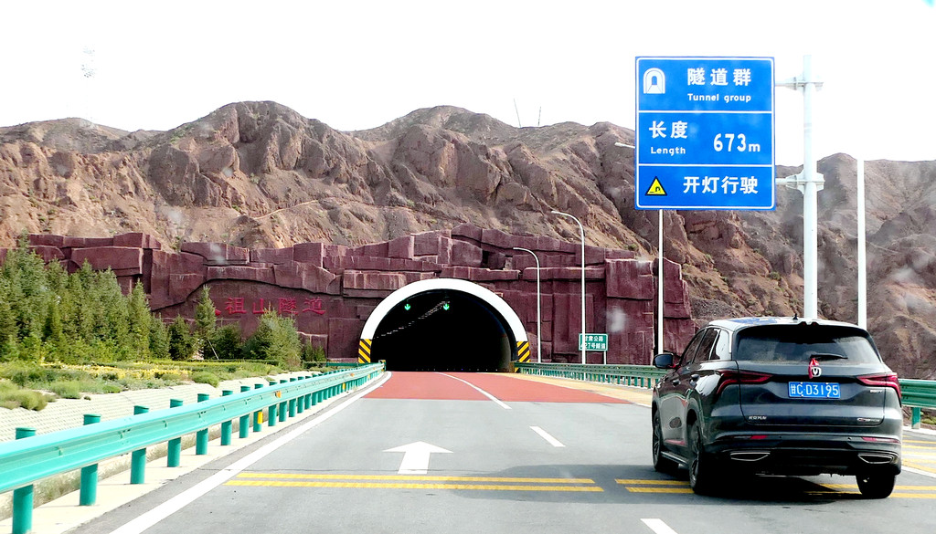 下一站“平山湖大峡谷”,我甚至都不知道它是在张掖的什么地方,不过X.J.胸有成竹,让我跟着他走就是了。从大佛寺出发,经“钟鼓楼”转入西大街向西、再向北,进入国道G312(沪霍线),继而又入“张阿公路”向北行驶。10:17过人祖山隧道,10:21过平易河收费站。10:36驶入路边港湾式停车区稍停,因为周边景致颇佳,停车拍拍照片。