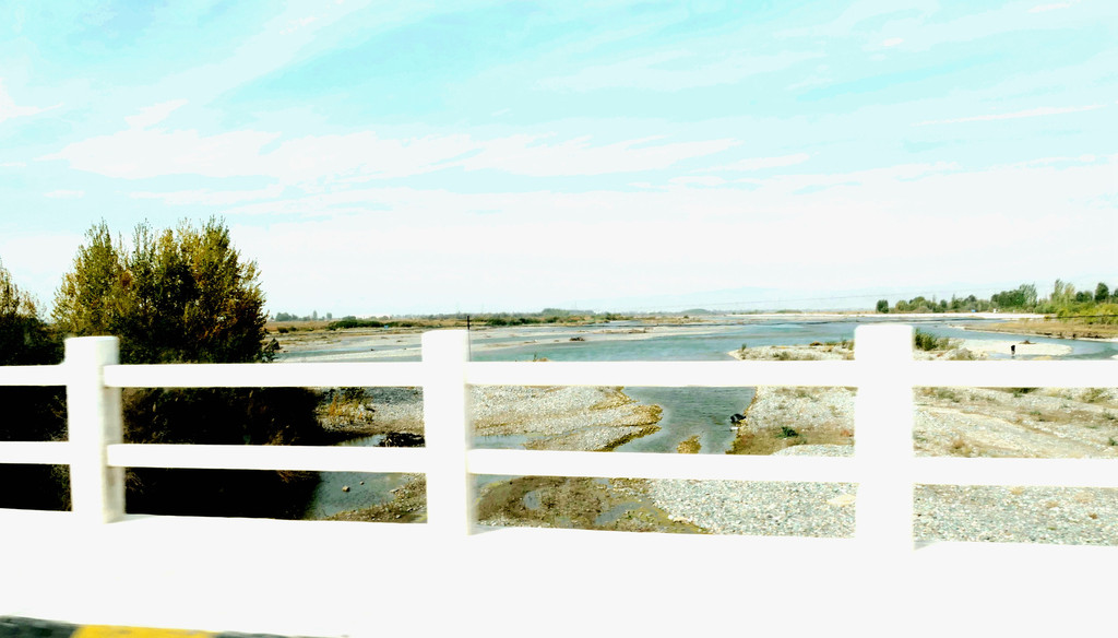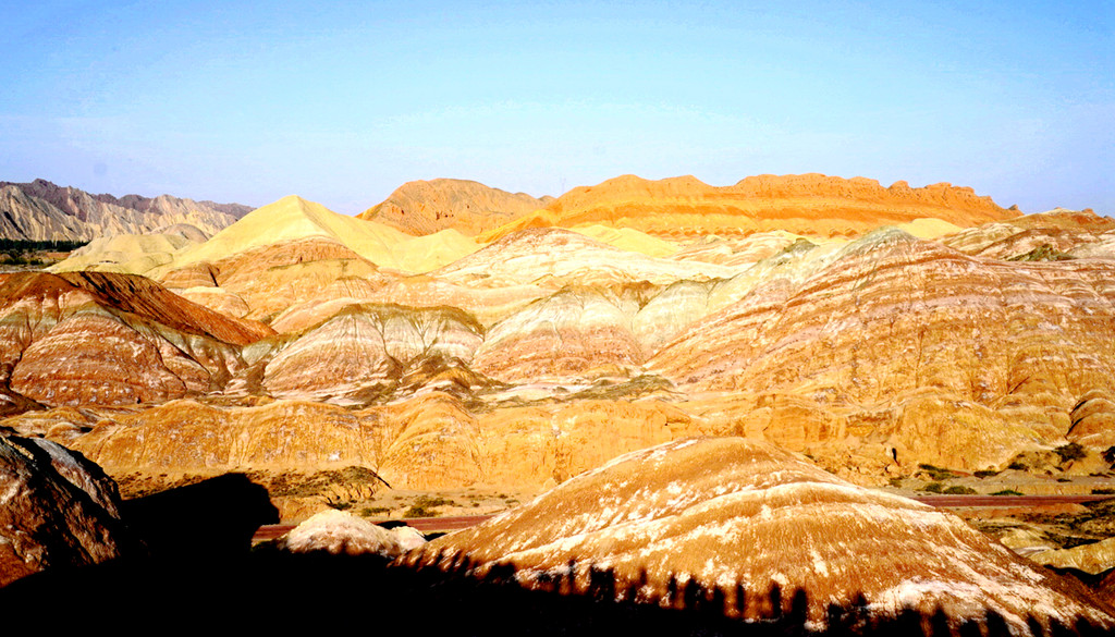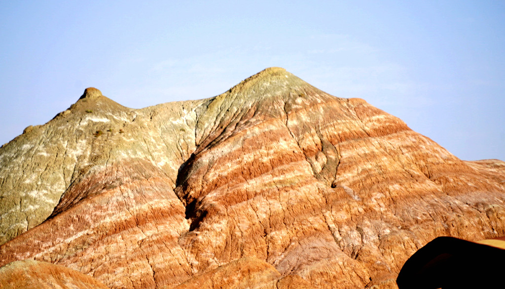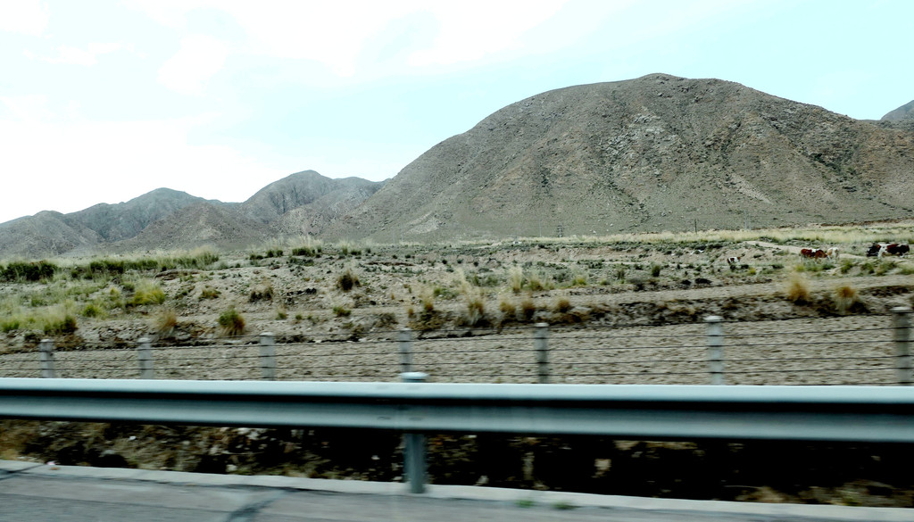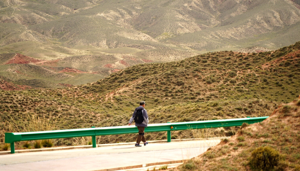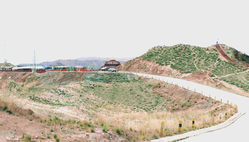 下一站“平山湖大峡谷”,我甚至都不知道它是在张掖的什么地方,不过X.J.胸有成竹,让我跟着他走就是了。从大佛寺出发,经“钟鼓楼”转入西大街向西、再向北,进入国道G312(沪霍线),继而又入“张阿公路”向北行驶。10:17过人祖山隧道,10:21过平易河收费站。10:36驶入路边港湾式停车区稍停,因为周边景致颇佳,停车拍拍照片。