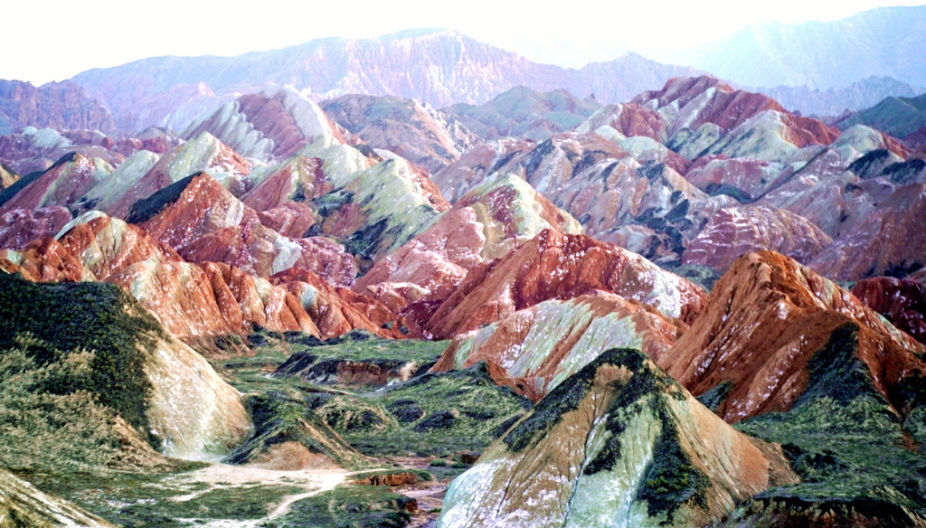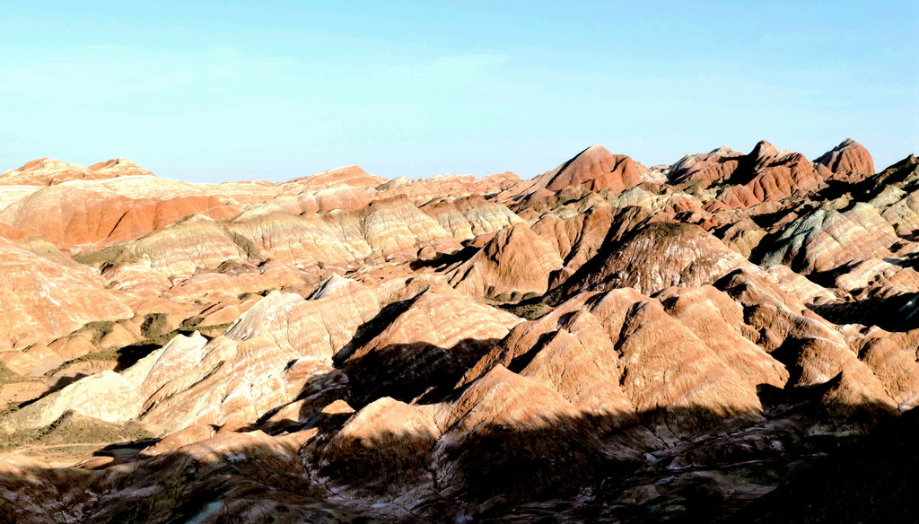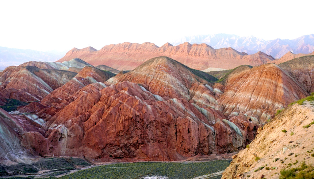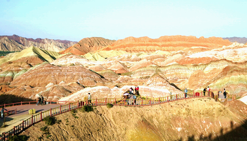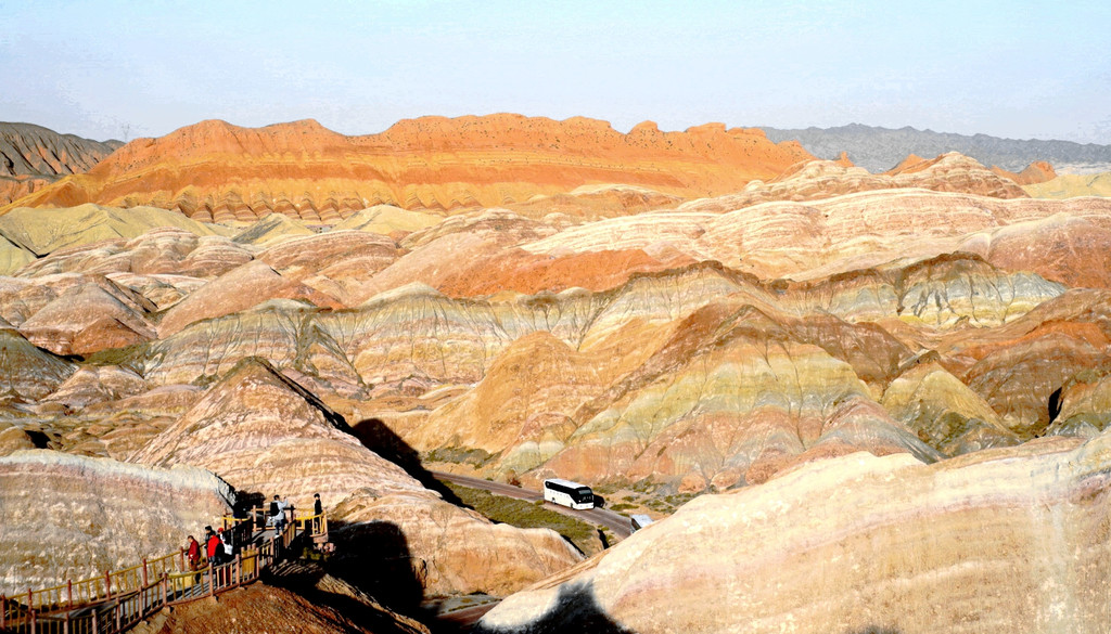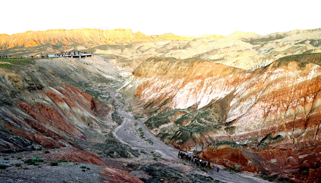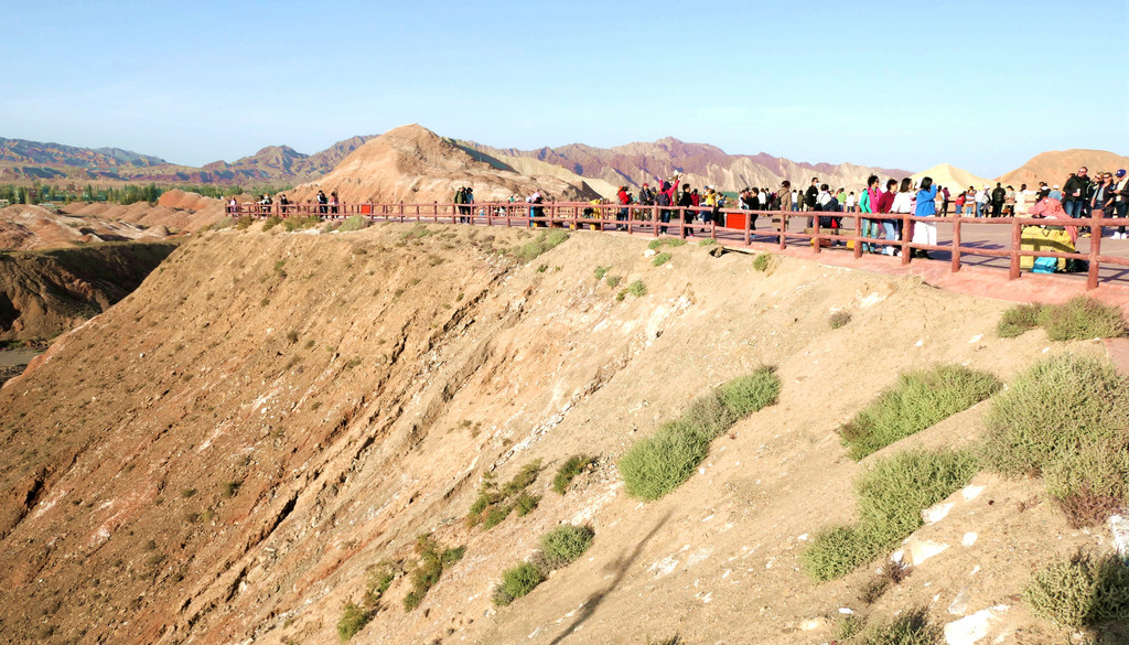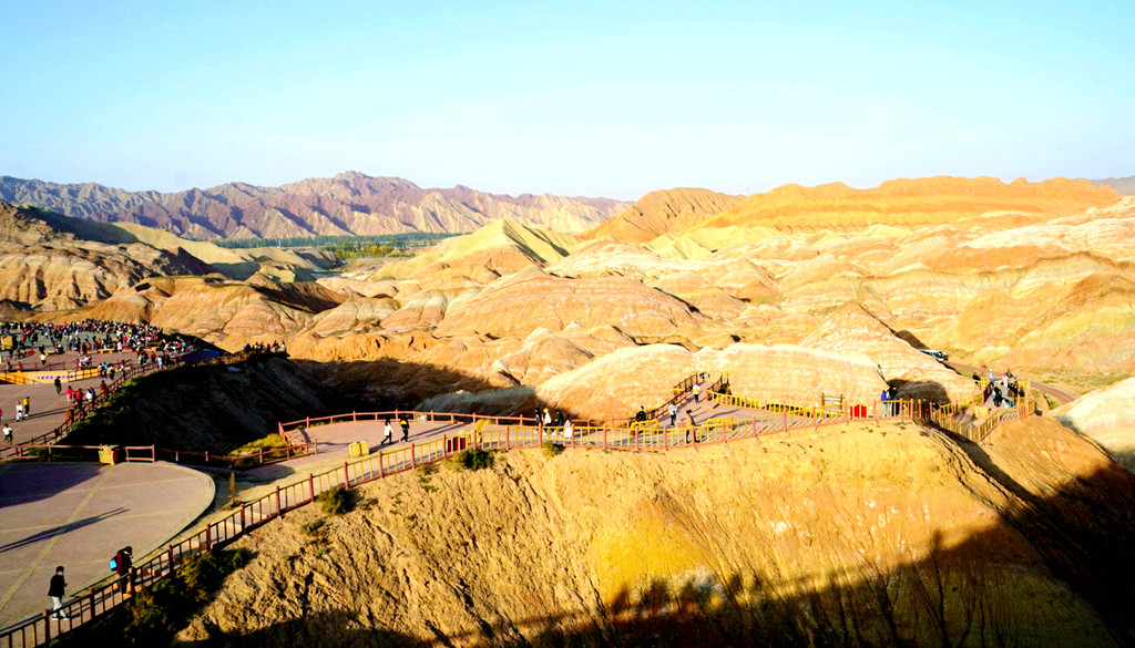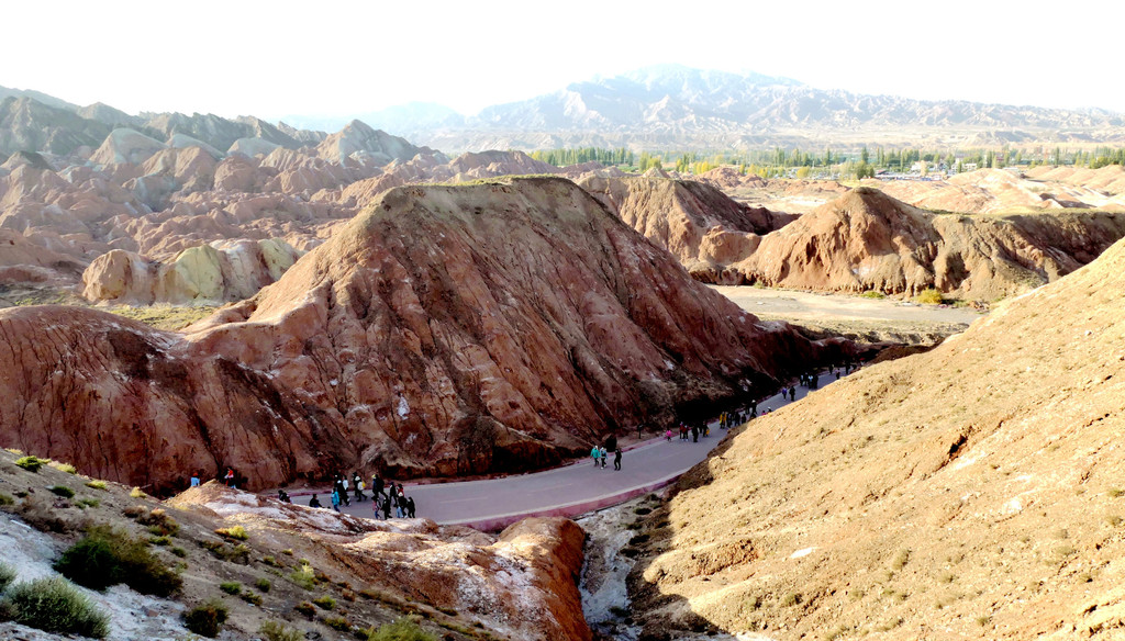 大观景台视野开阔,周边全为光秃秃的山丘,几乎寸草不生。我们此刻所在的“张掖七彩丹霞”与上午曾经去过的“张掖平山湖景区”均属丹霞地貌,但两者的景观却是截然不同:“平山湖”的丹霞山丘千奇百怪,但色彩却是唯有红色,这里恰恰相反,山丘造型平淡无奇,但其色彩却是光怪陆离,变幻无穷。站在观景台上向北眺望,丹霞缝隙间露出一大片的绿洲,植被茂密绿影葱葱,那里就是景区的西门。