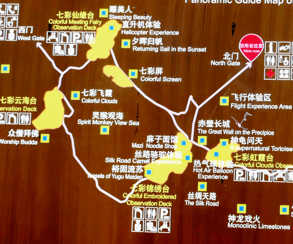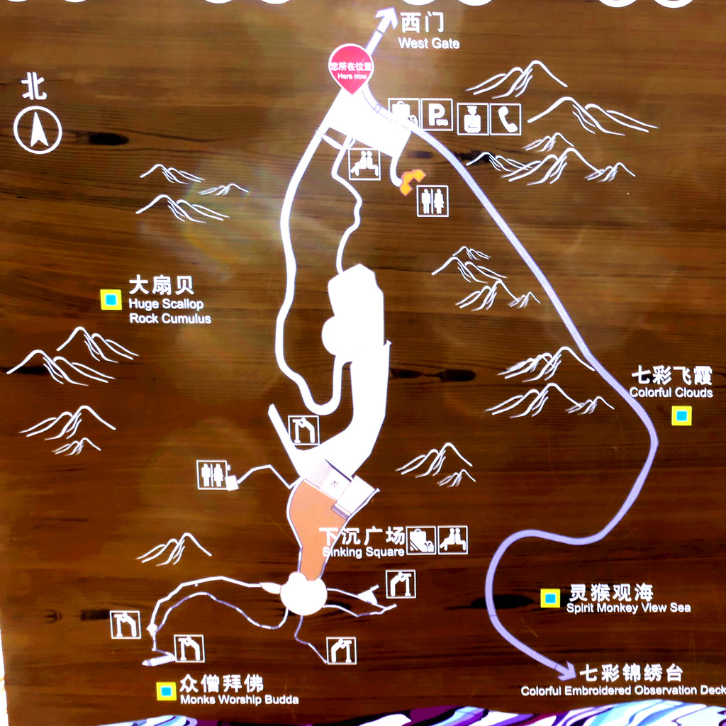 西门线路:西门→七彩云海台→七彩锦绣台→七彩红霞台→七彩仙缘台→西门