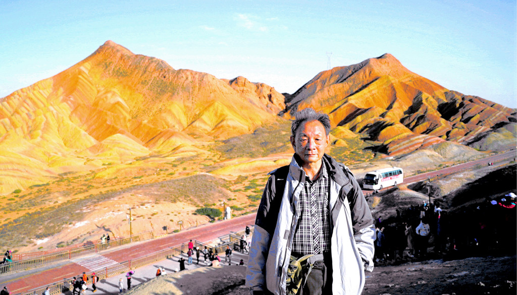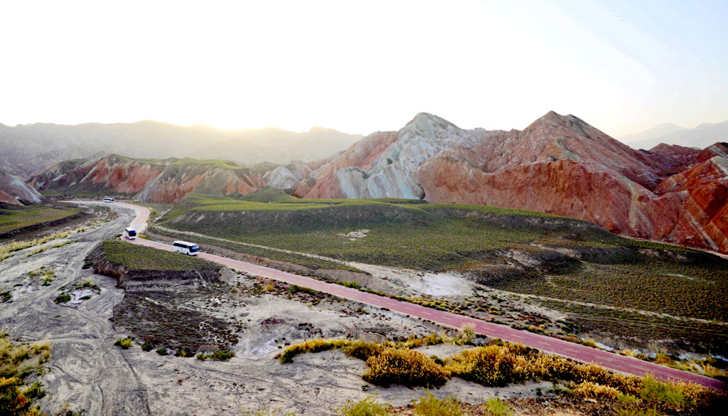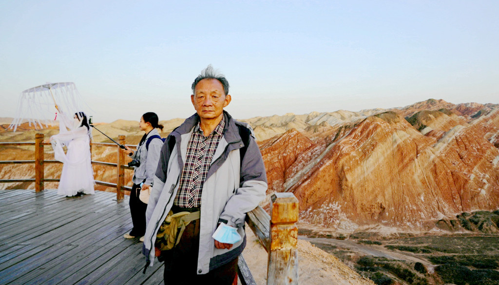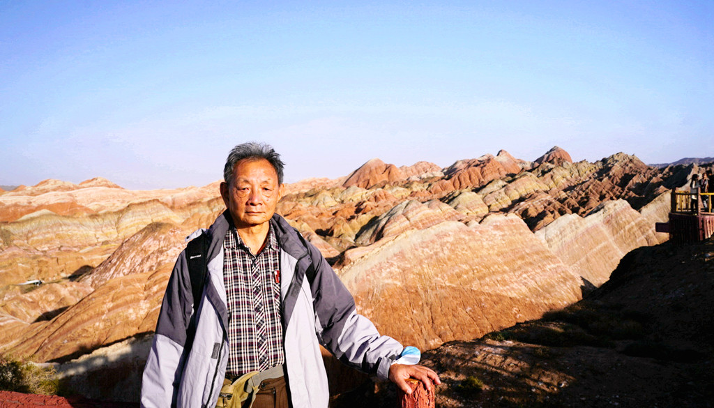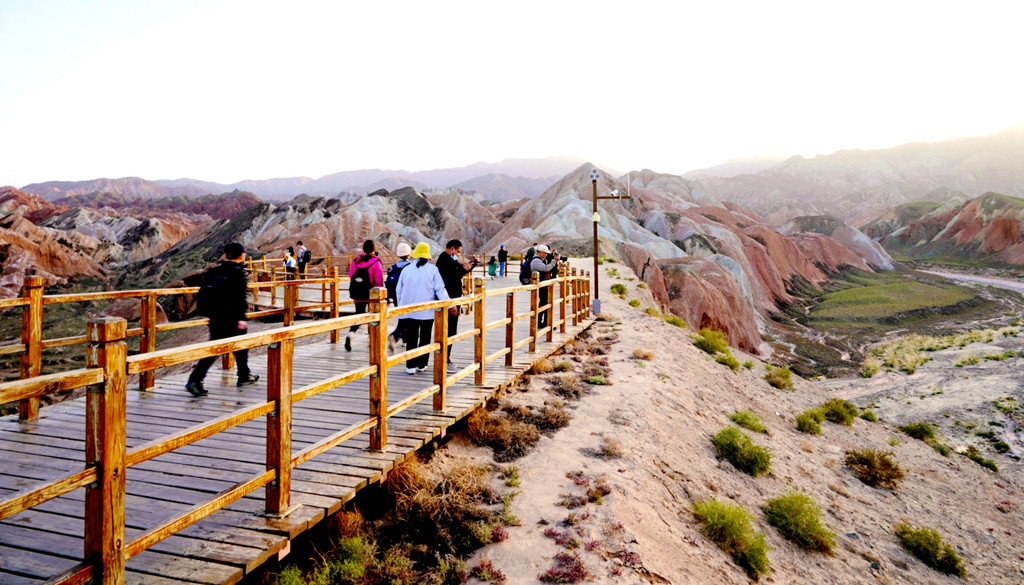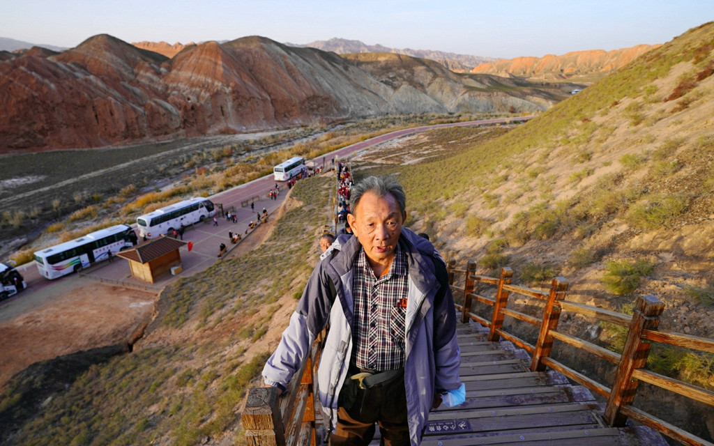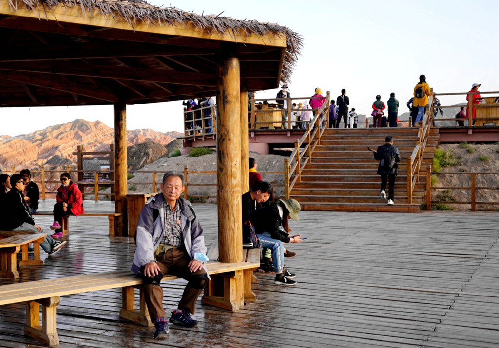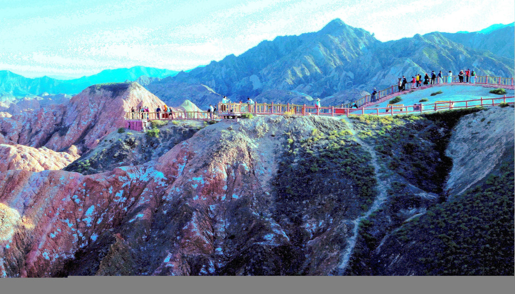 我们是18:06抵达七彩锦绣台,下车后沿木阶梯登山,此处海拔1800多米,再说已是年过八旬,攀登起来还是比较吃力,需要中途停留、大口喘气,登上山顶也得赶忙歇息片刻。观景台与木栈道都是沿着山脊而建,游人在山脊上行走,左右两侧的山下风光都可尽收眼底。左侧山下就是我们乘车过来所走的公路,路边山坡上的丹霞纹理近乎垂直下落,好像是一束束的“流苏”,故而得名“裕固流苏”。“裕固”是当地少数民族,服装多用流苏为饰。