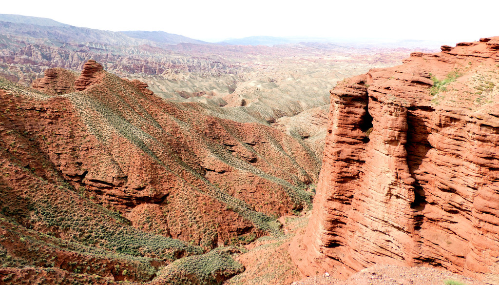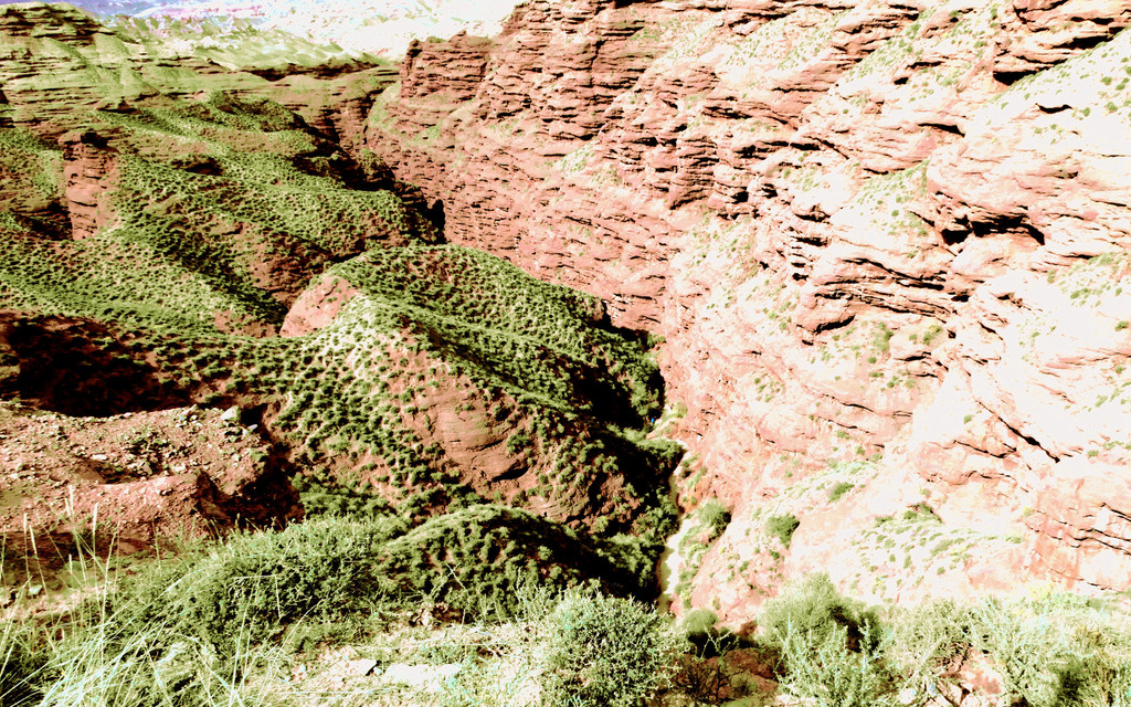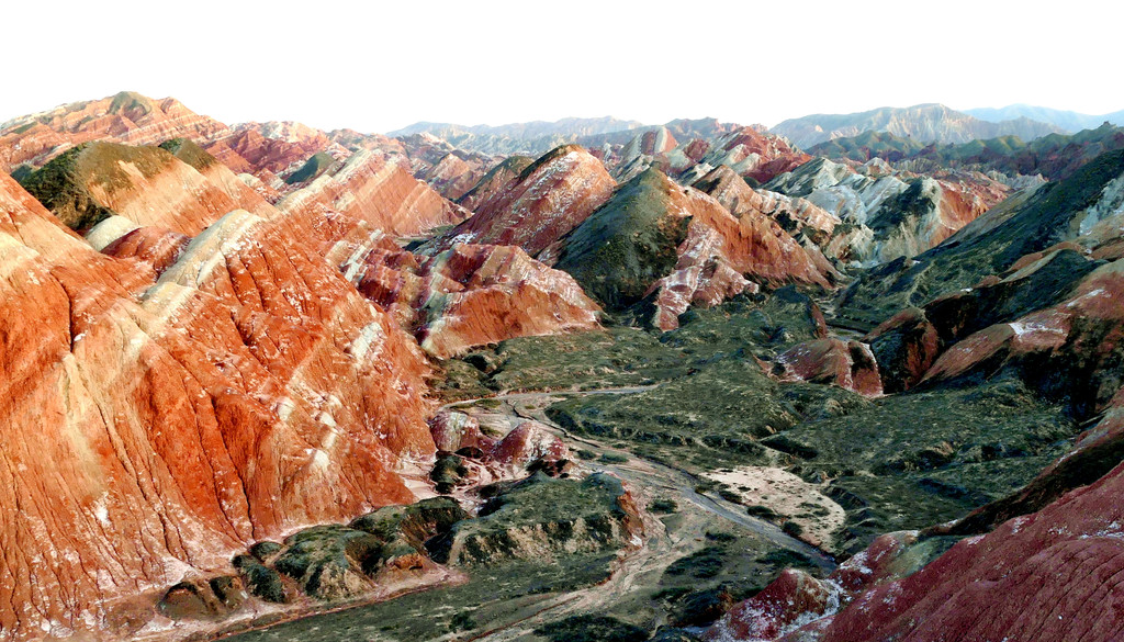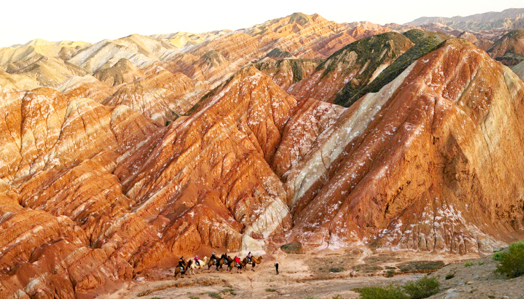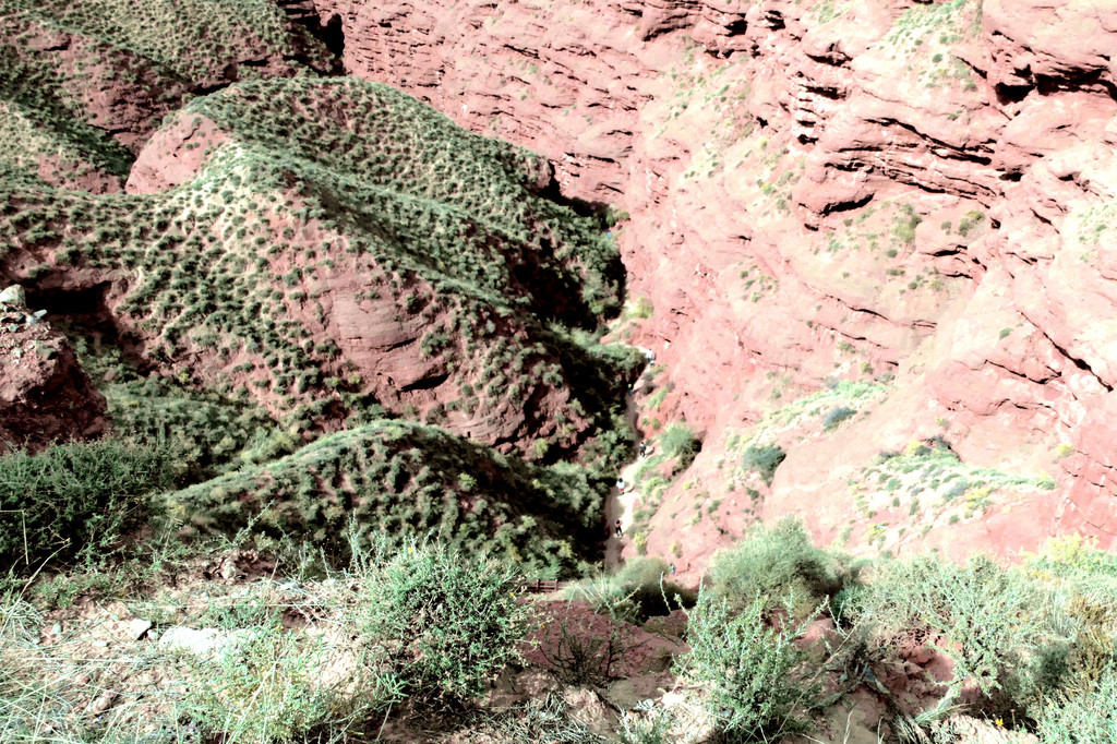 观景台右侧是一道深深的峡谷,遥望尽头好似有条小溪,干旱的山谷也随之出现了一大片的绿色。这里的丹霞更显浓墨重彩,纹理好似华丽缎带漫天飘舞,故而景点得名“丝绸天路”。