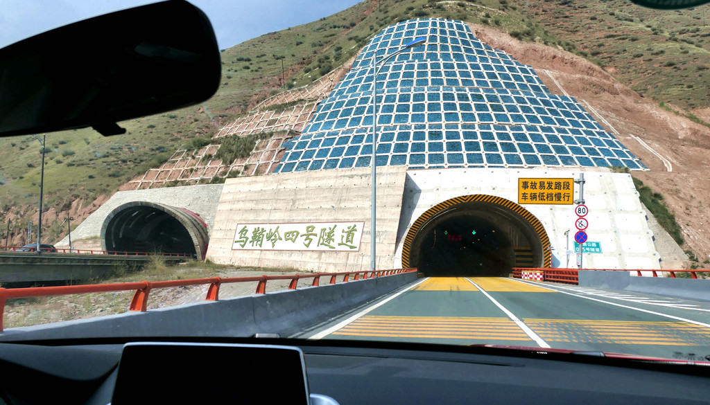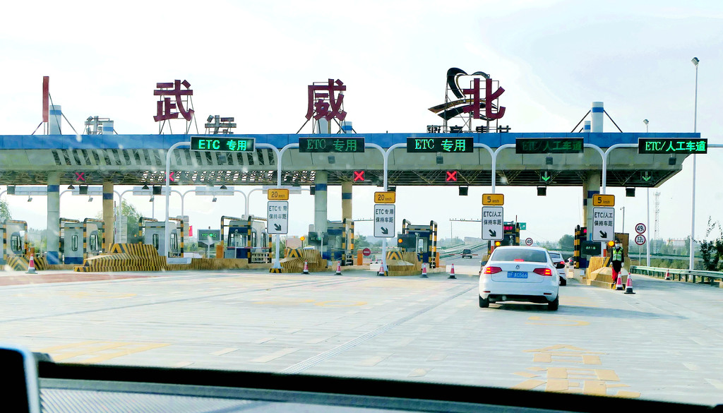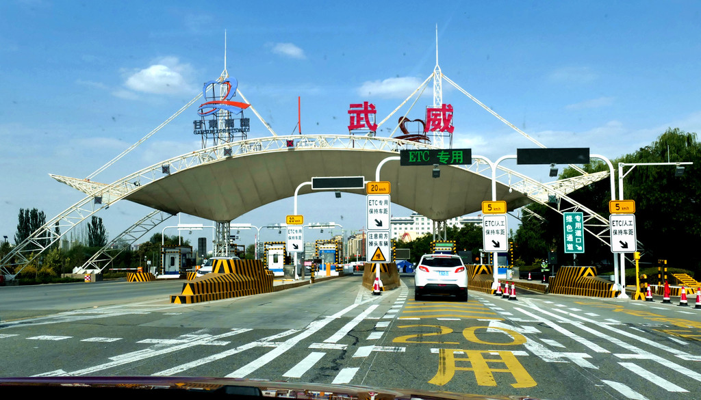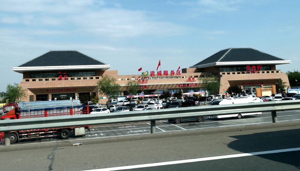 14:03穿越“乌鞘岭隧道群”,经过武威市辖古浪县,14:29又通过古浪隧道,到此就算是已正式进入河西走廊,改为向西北方向行驶。14:56驶经“武威服务区”,武威是历史文化名城,服务区也显古香古色。