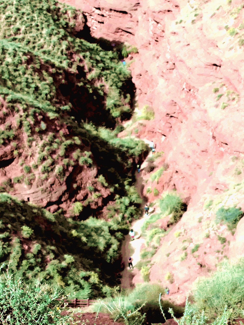 逗留大约十分钟后继续沿栈道前行,13:13 走过一处岔道路口,右侧有小路下山,那就是进入大峡谷的通道。其实,真正完整的A线观光就应该是沿着这条小路下山,在山下的大峡谷内绕行一圈,然后再爬坡上山,走到四号观景台去乘车。然而,现时的绝大多数游客走A线都是直接沿山顶栈道前往四号台,回避了下山进入峡谷的行程。我们两人站在高处俯瞰,正在沿小路进入峡谷的游人细小得好似蚂蚁,估计落差足有一百五、六十米,X.J.见此情景不再提起进入峡谷之事,我自己则是从一开始就没打算要下山。