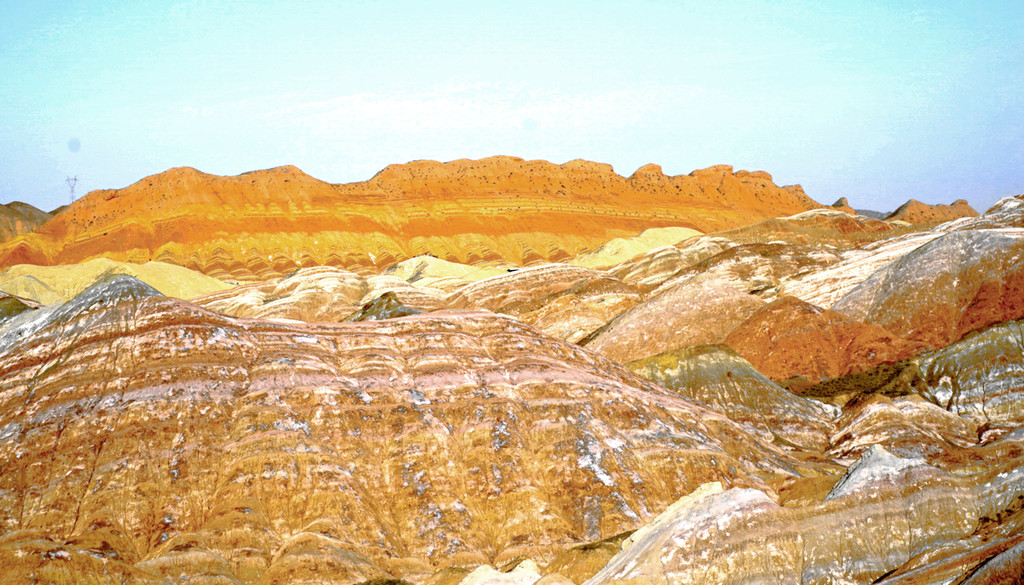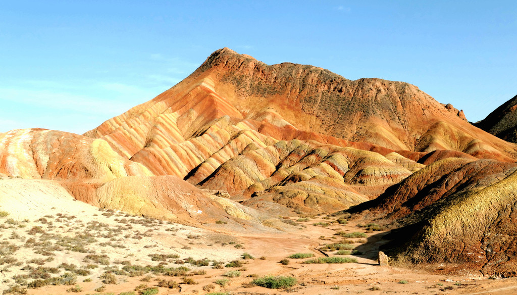 登高眺望四周,满眼都是五彩斑斓,赤、橙、黄、绿、褐、白、灰色的岩层纹理顺着山势起伏,好似成群的彩带在山间飞舞,场面之壮观、气势之磅礴、色彩之艳丽,着实令人赞叹,难怪此处被称“七彩丹霞”。据说,现在是晴空干旱,丹霞还不算最艳,若是在雨后,丹霞的色彩会更加分明,也更加漂亮。