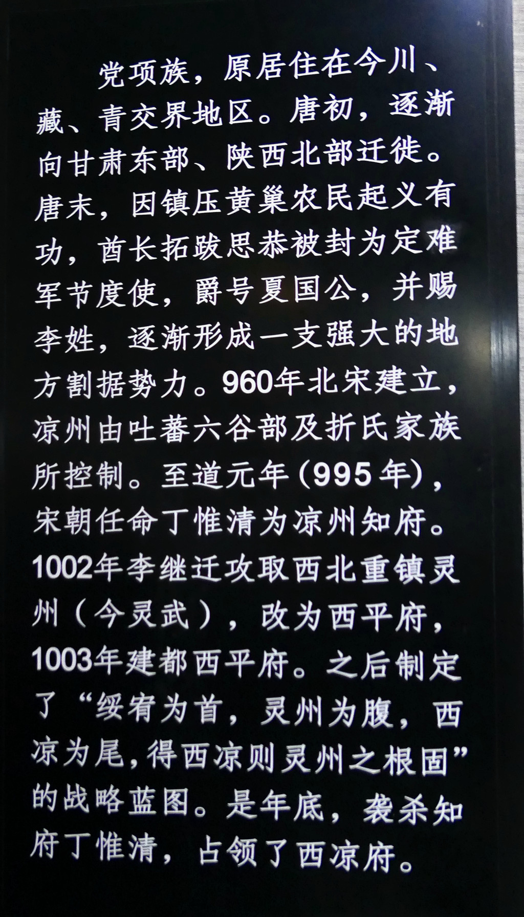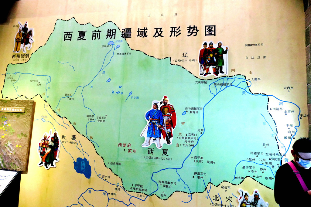 武威古称“凉州”,曾为“西夏”古国的辅郡(陪都),西夏是公元11~13世纪由党项民族在我国西北建立的地方政权,疆域“东尽黄河,西界玉门,南接萧关,北控大漠,地方二万余里”。它与宋、辽、金鼎足而立,延续近200年,也曾创造出辉煌而又独特的西夏文明。后来,西夏国被蒙元所灭,党项民族神秘消失,西夏文明也就从此变得鲜为人知。武威是国内保存西夏文物最多的城市,专门建有一座“武威西夏博物馆”。