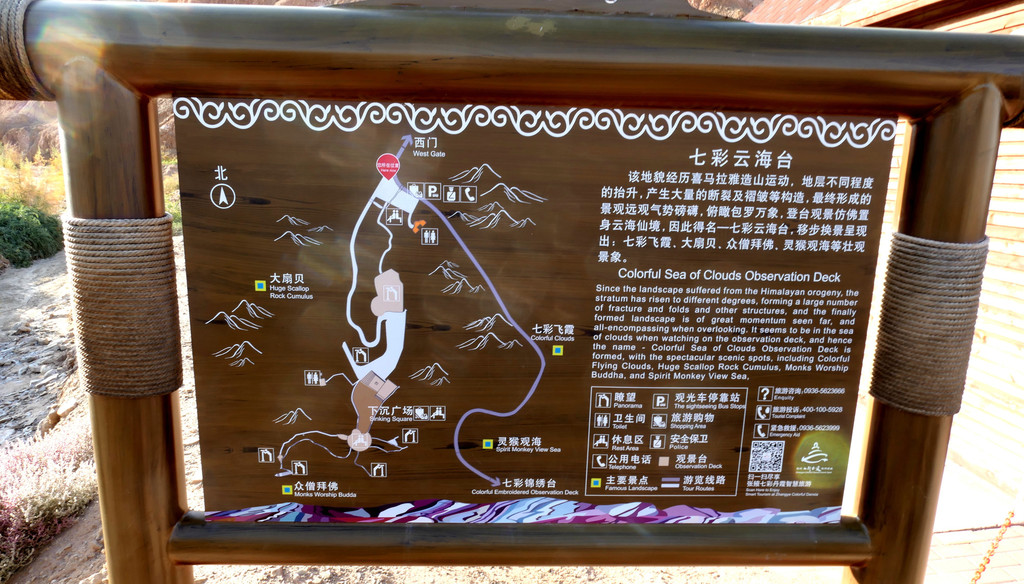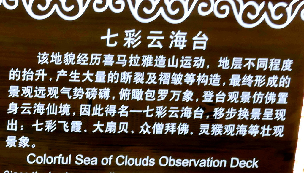 大观景台称“七彩云海台”,这是因为丹霞峰群地域辽阔,游人站在观景台上就仿佛是登临高山眺望云海一般。景区文字介绍:这种神奇景观是源自6000万年前的喜马拉雅造山运动,“造山”致使地层抬升,抬升程度的差异又造就了大量断层、褶皱,最终就形成了眼前这种山丘起伏好似浓云翻滚的场景。