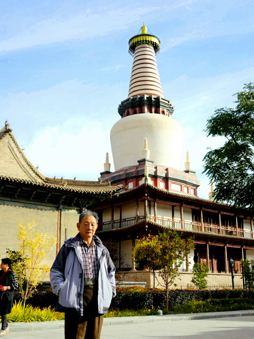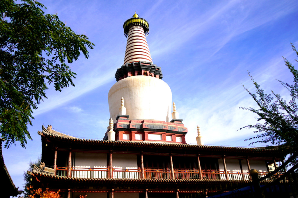 大佛寺内的另外一处著名古迹就是“土塔”,它是古代张掖著名的“五行塔”之一。张掖古称甘州,城内佛塔甚多,曾有“一城山光,半城塔影”之说,其中,尤以金、木、水、火、土塔最为著名,当年统称“五行塔”。然而,斗转星移岁月流逝,当年的五行塔如今唯有“木塔”与“土塔”尚存。木塔现存张掖古城中心广场旁的木塔寺内,土塔就是眼前这座覆钵式喇嘛塔,其独特在于主塔下部两层台座的四隅各有小塔一座,形成八小塔簇拥一座大塔的造型,属国内罕见。我2008年来大佛寺亦曾见过这座宝塔,与当年相比,现时的佛塔也明显是曾经维修,感觉焕然一新。