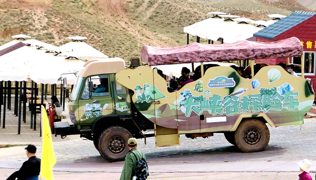 10:48抵达“平山湖大峡谷”游客中心,售票大厅内有专门的导游向游客介绍景区内各种游乐项目,然而,众多游客包围一个导游,大家七嘴八舌,让我们听得一头雾水,最后是请教一位保安,听他耐心讲解,方才悟出一些门道。原来,真正的景区距离游客中心还很远,必须乘坐交通车前往,因而,购买门票(100元/人)还须搭配交通车票(30元/人)。景区游览共有A、B两种线路可选:A线路主要就是四座观景台,它们之间有长长的栈道连接,栈道与观景台都是位于大峡谷顶部的山上,视野十分开阔,而且,基本上都是走平路,可以轻轻松松地游览,但其缺点是远离大峡谷,无法真正感受到大峡谷之雄伟,除非是自行沿小路下山,进入山下大峡谷内游走一圈,然后再徒步攀爬返回山顶,这样一个来回就会非常幸苦 ;B线是抵达景区后还得搭乘专门的“探险车”,经由专门的线路下山,直抵大峡谷底部,然后再经过徒步、搭乘骆驼车、再徒步、再骑骆驼,最后也是要徒步攀爬返回山顶。此线路的优点是能够真正看到大峡谷的壮丽,体验疯狂穿越的乐趣,但缺点是花费较大,探险车、骆驼车、骑骆驼都需额外购票。X.J.听后非常向往B线,他也并不在乎花钱,于是,在那位保安的怂恿下,我们决定走B线。然而,前往购票却获知,B线有年龄限制,65岁以上婉拒,于是,我们只得选A线,买了一张门票、两张交通车票,我因为是70岁以上免门票。X.J.没能走B线,表情难掩失望,保安告诉他走A线也可独自下山进入峡谷一游,只要我能在山上等他即可,我表态没问题,X.J.听后不置可否。
