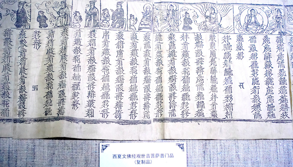 此外,这座博物馆内还有木缘塔、西夏木板画及西夏泥活字版经文等展品,都是国宝级的文物。对于各类博物馆,X.J.一贯都是兴致颇高,因为能够增长见识,今日也看得颇为仔细,一座面积不大的西夏博物馆,让我俩逗留约45分钟。博物馆旁边还有一座武威文庙,也是全国重点文物保护单位,国家AAAA级景区,但我2008年曾经光顾,感觉没啥可看,X.J.对古建筑、寺庙兴趣不大,我也就没鼓励他进入文庙参观。
