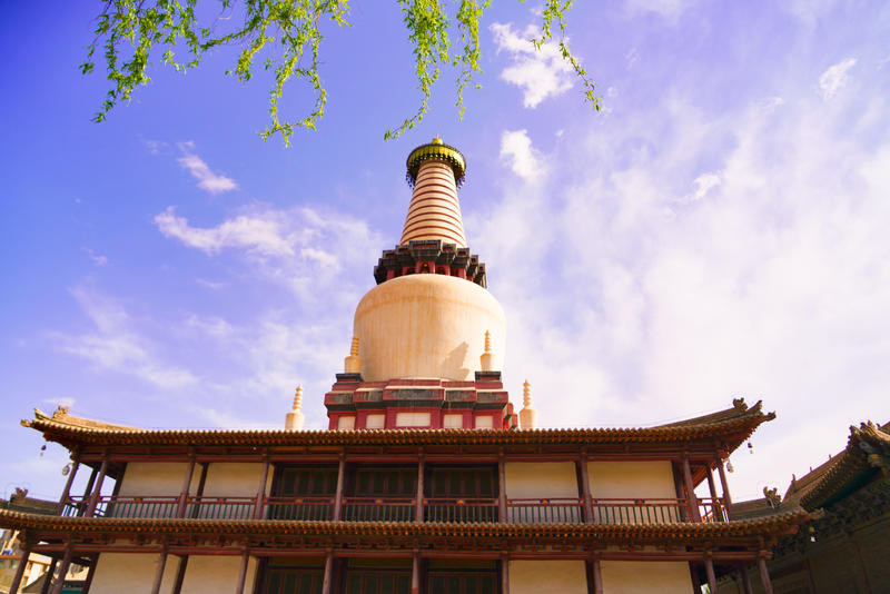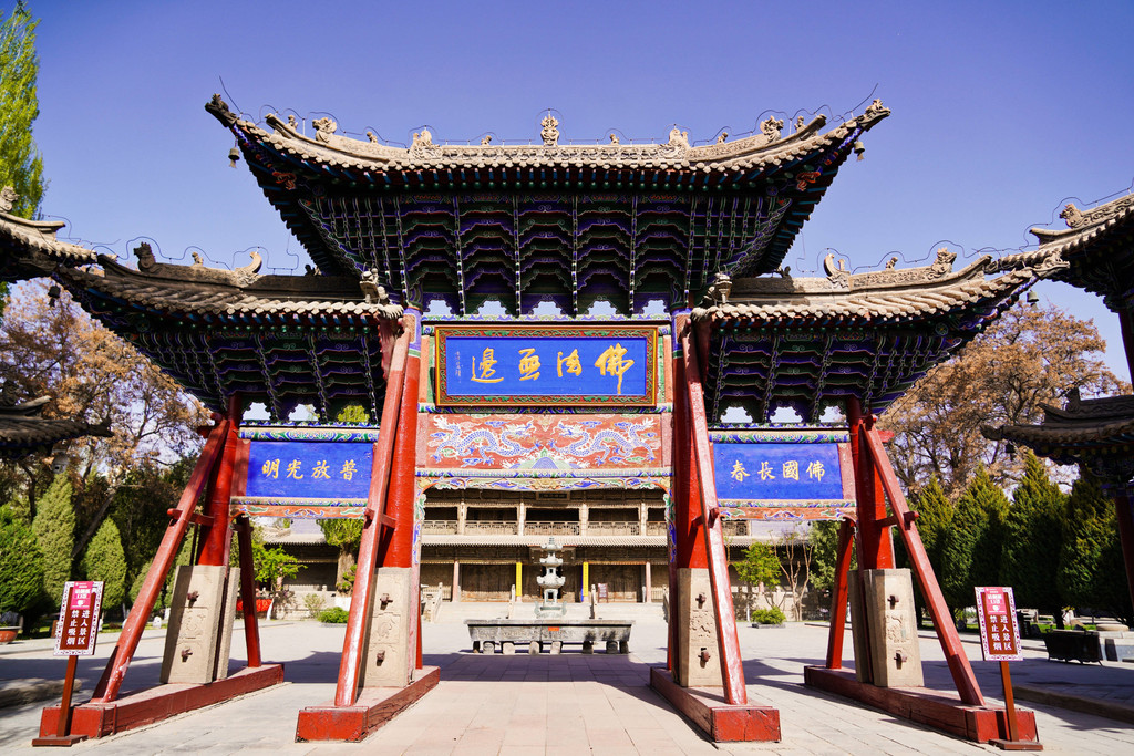 大佛寺呈中轴线对称分布,正殿中轴线最后是一座气势恢宏的土塔,随风摇曳的铃响,与幽幽梵音相呼应。大佛寺不仅是张掖人的骄傲,也是河西走廊佛教文化荟萃的结晶。如今正值甘州春光烂漫,寺内繁花盛开,垂柳依依,亭台楼榭间春意闹,美不胜收。