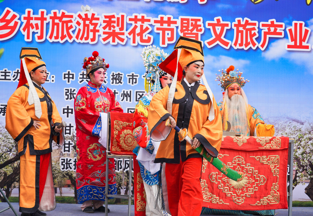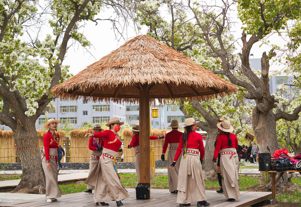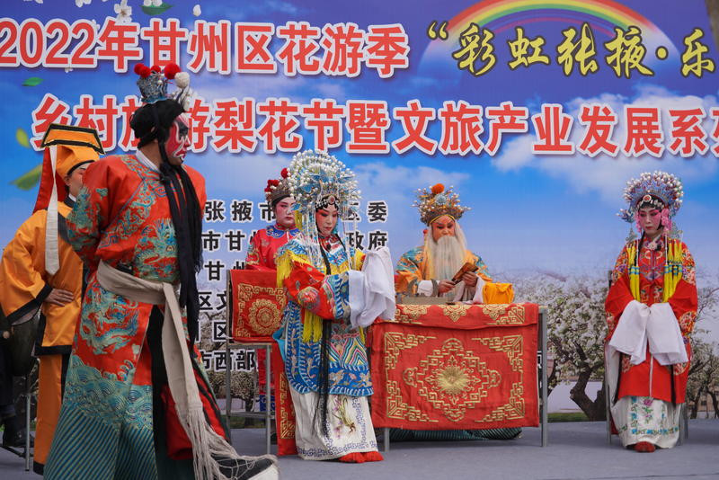 在星罗棋布的梨花园中,不仅可以赏洁白如玉般梨花,还能体验甘州当地的民俗,载歌载舞的藏族、梨花树下高歌的蒙古族、高昂激越的秦腔、舞姿曼妙的飞天舞、芦苇丛中的书画文学、非遗剪纸等。