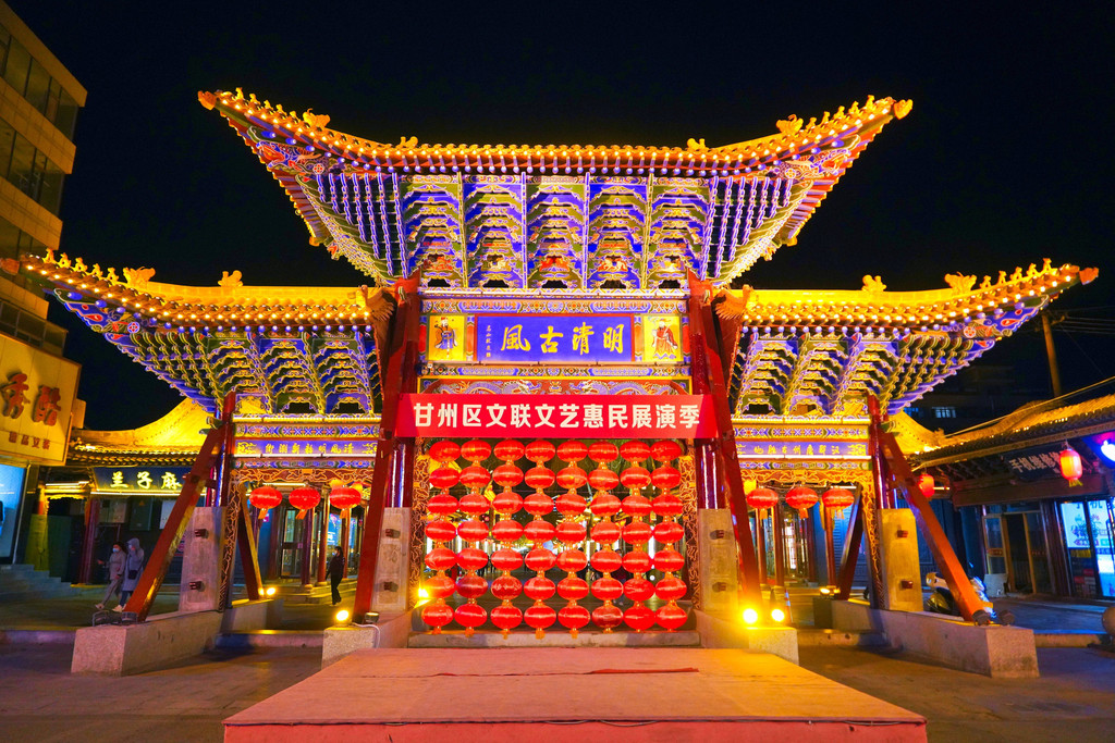 在张掖的老城区有个仿古步行街,它就是明清街,这条街也美食为主,有主要是西北美食为主,也有外地的川菜,火锅。。夜晚灯火璀璨,颇有宫廷风范。街道不长,但是夜生活浓郁。明清街由四大街,八小街,七十二蚰蜒巷构成,呈现来龟甲上的八卦图案,经纬交织,井井有条。街道中间有很多仿古雕塑,民间游戏捉迷藏、放炮仗、中医问诊等场景,古色古香,美轮美奂。