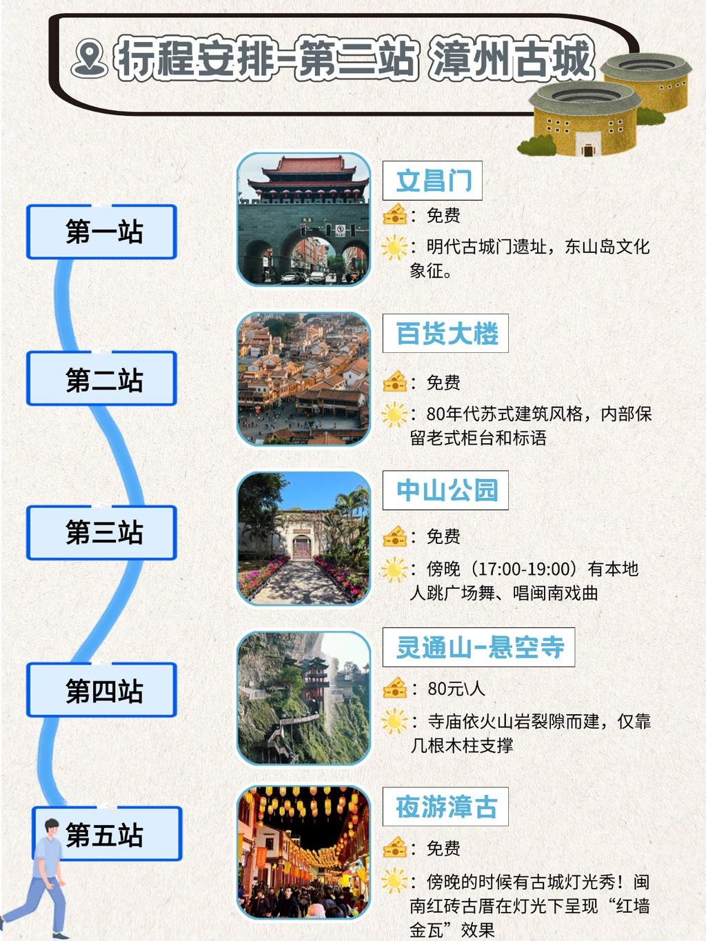 接着逛漳州古城🏮 明代文昌门拍照氛围感拉满📸 百货大楼藏 80 年代复古故事🕰️ 傍晚中山公园烟火气足,灵通山悬空寺依岩而立超神奇🙏 夜游看灯光秀,沉浸式感受闽南韵味✨