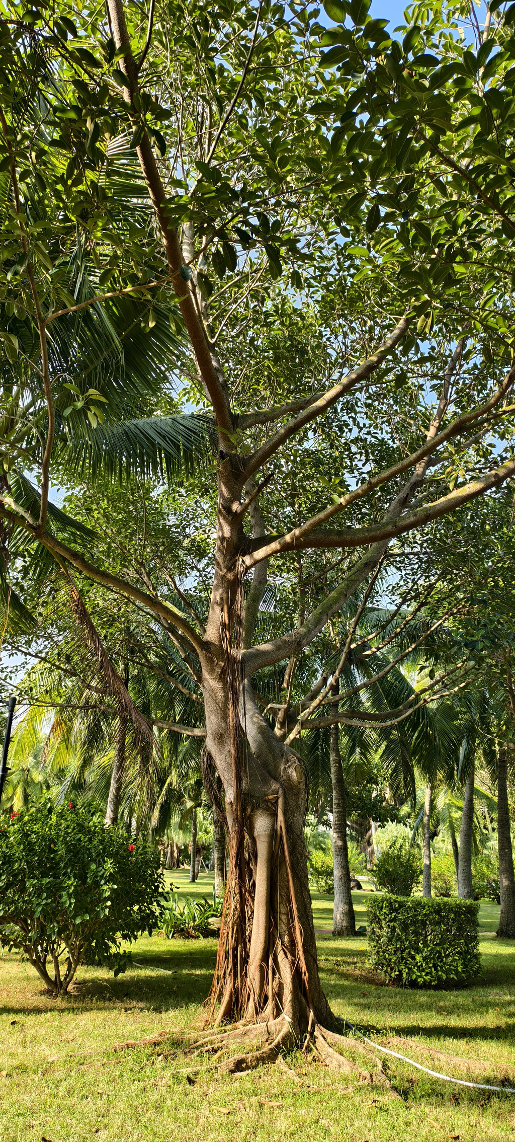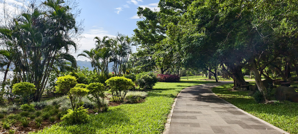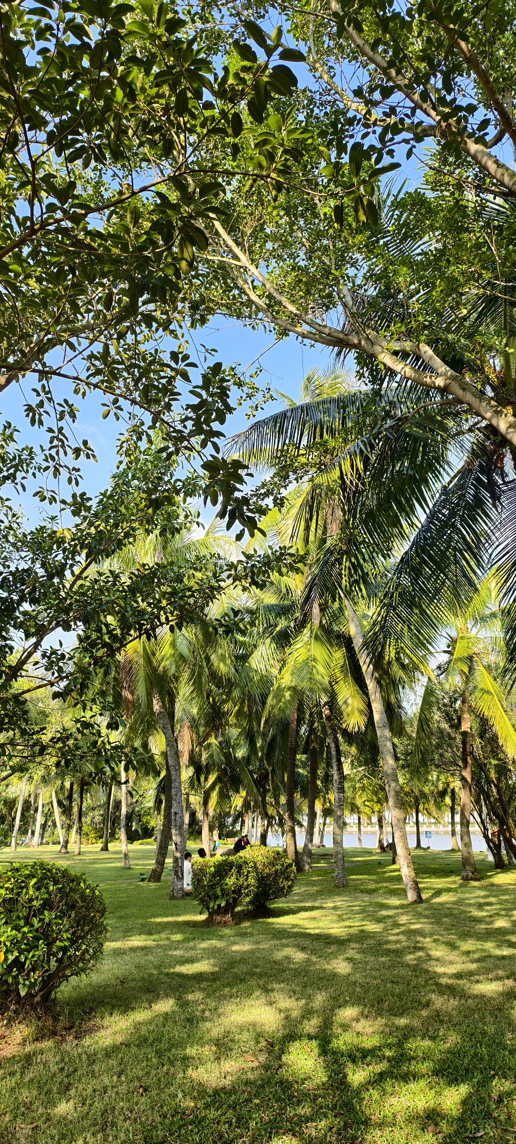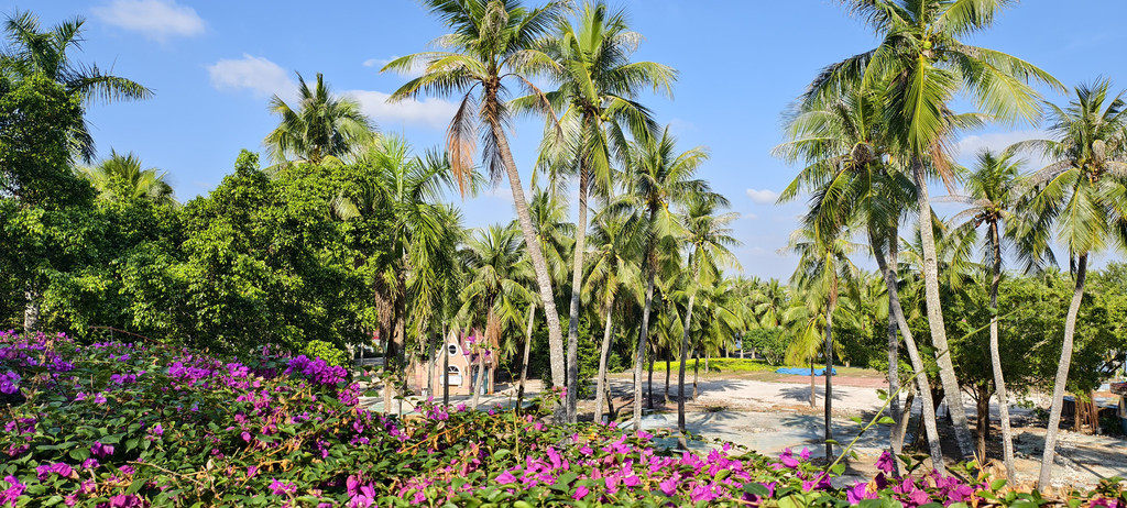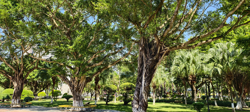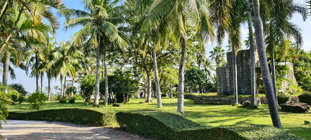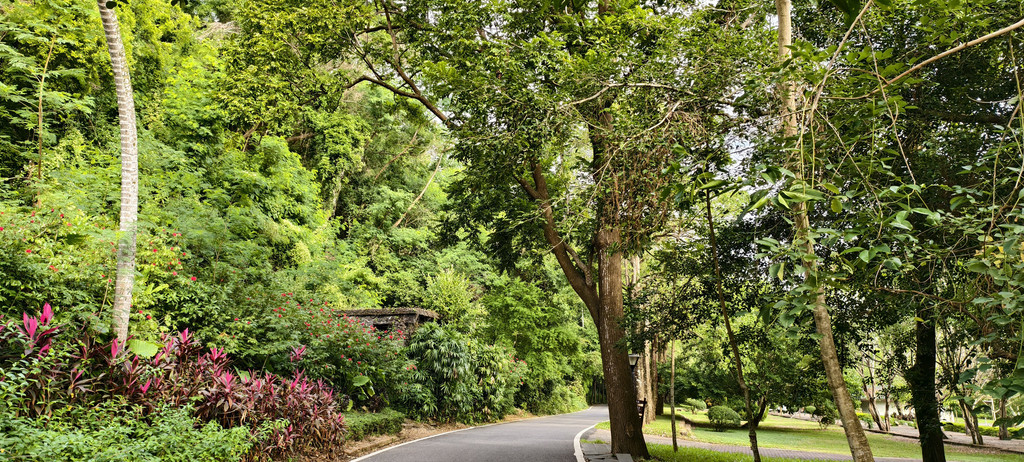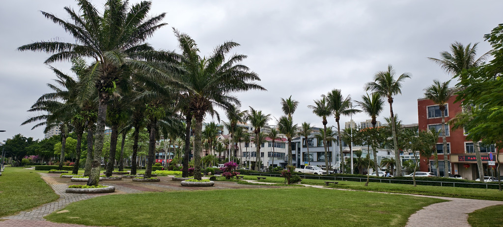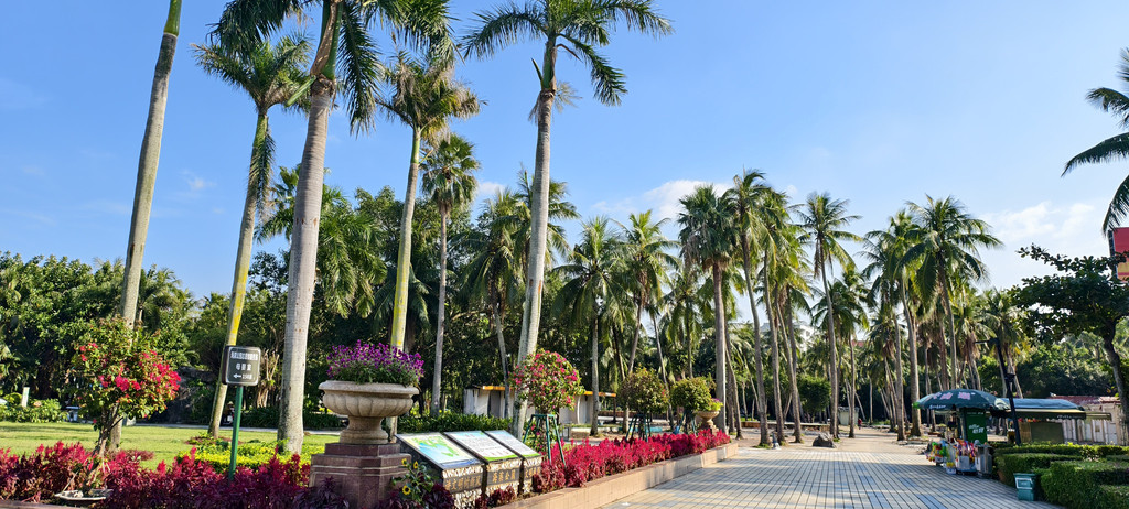 一个完完全全的热带风情公园,椰树摇曳,绿草油茵,花色芬芳,古木怪树,密密丛丛。