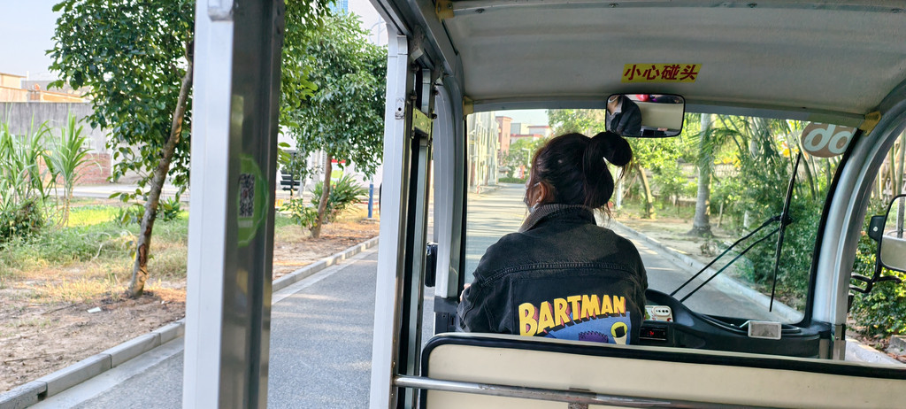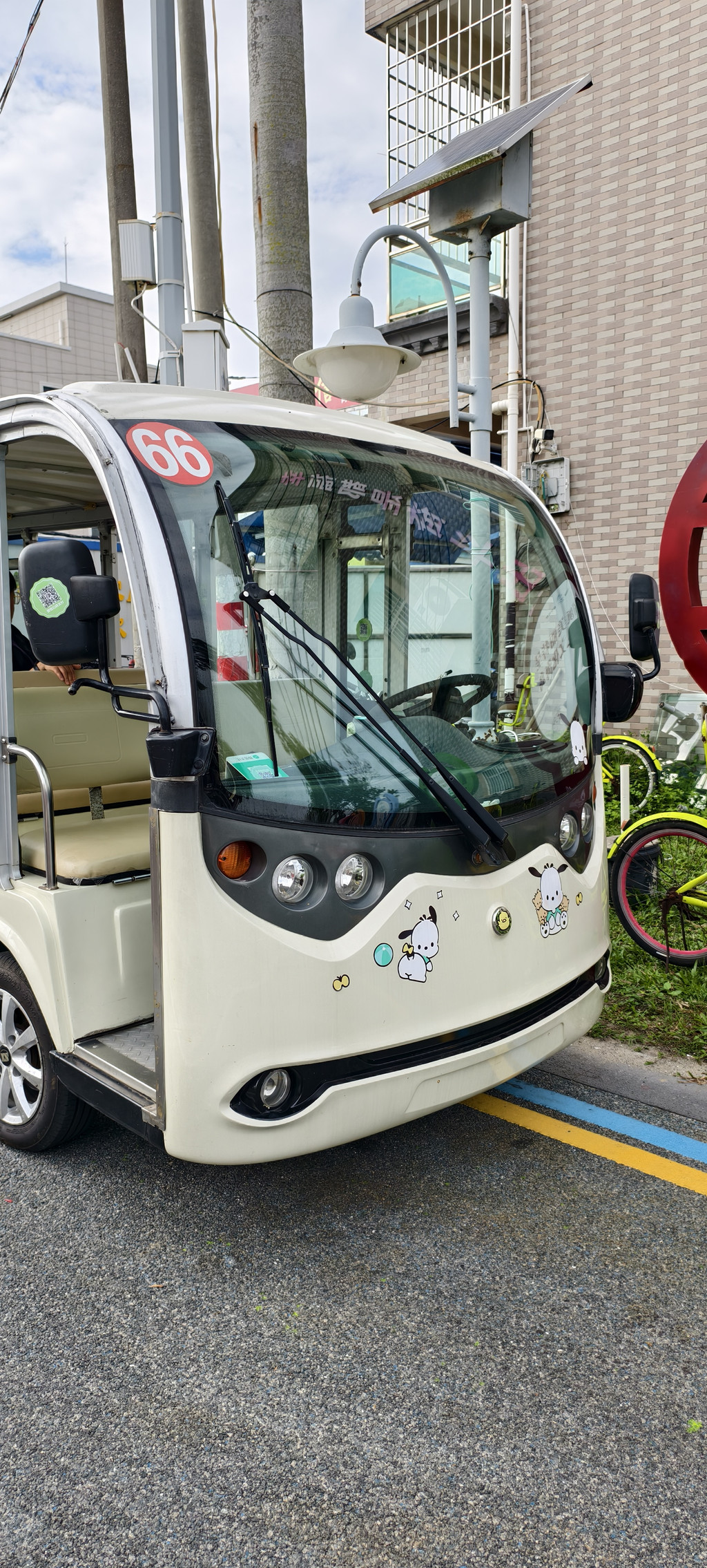 在这粉色的车站里等着把我们带到坡头区的公交。