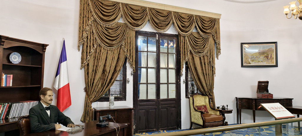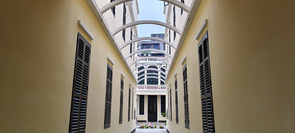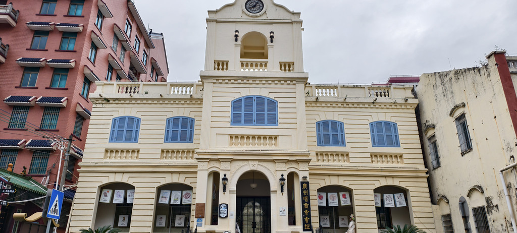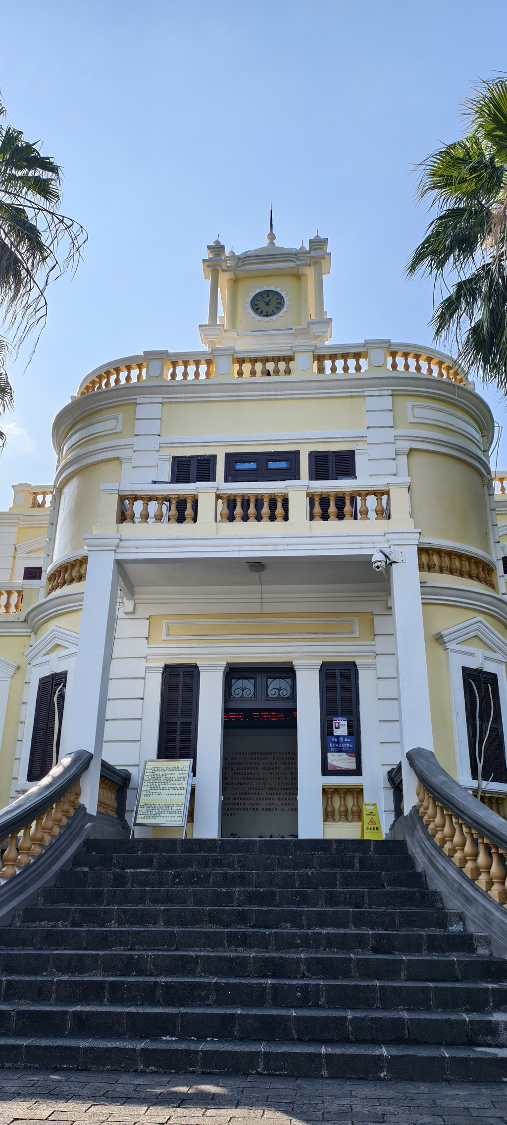 从硇洲岛回城,公交的终点站边上看见一栋鹅黄色的小楼,你会觉得它和周边格格不入。门窗仿哥特式,采用大量的浮雕工艺;正门为弧形台阶,二、三层楼前部均有欧式花栏围廊,筑有钟楼。原来这座法式建筑就是湛江市百年历史的见证物——广州湾法租界公使署旧址。
