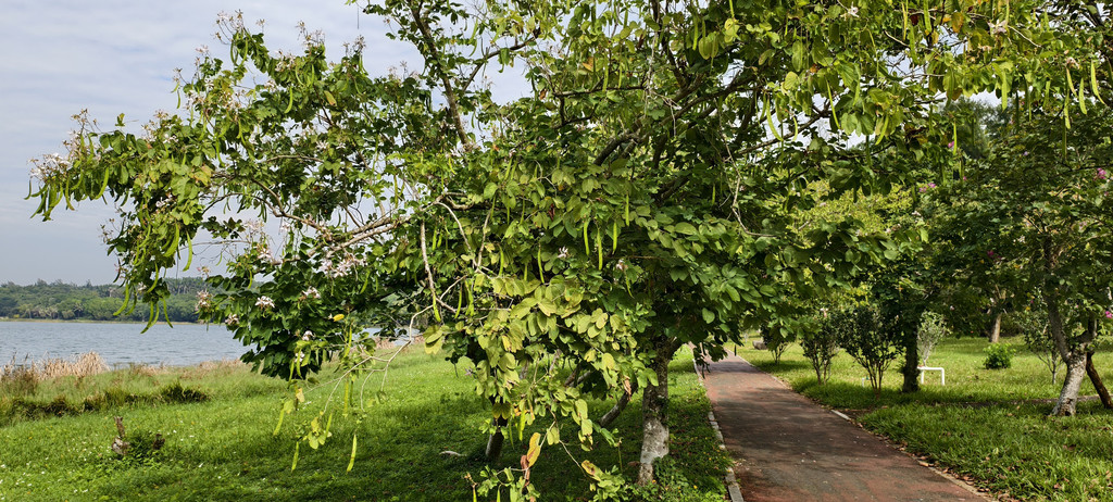 你们看,下面几张图片里的树,应该就是湛江市树——红花紫荆;天暖的时候花朵为红色或粉红色,天冷结果时就花朵为红色或粉红色。