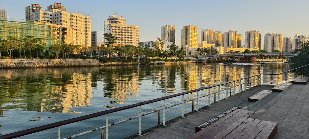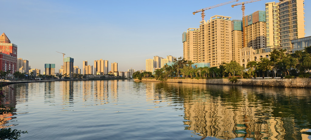 被清晨阳光洒满的建筑倒影在钟楼北面的海甸溪,波光粼粼。