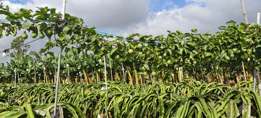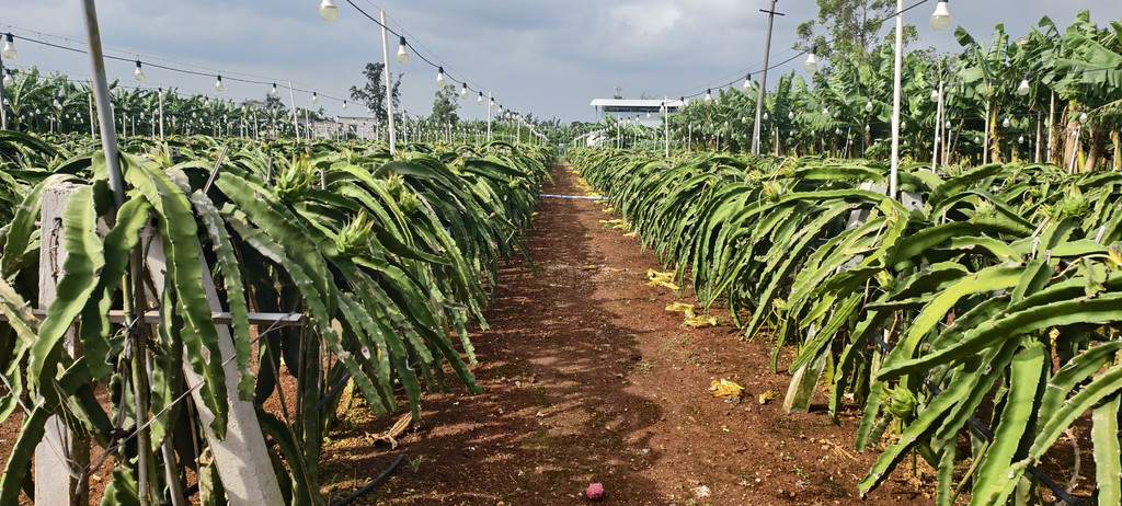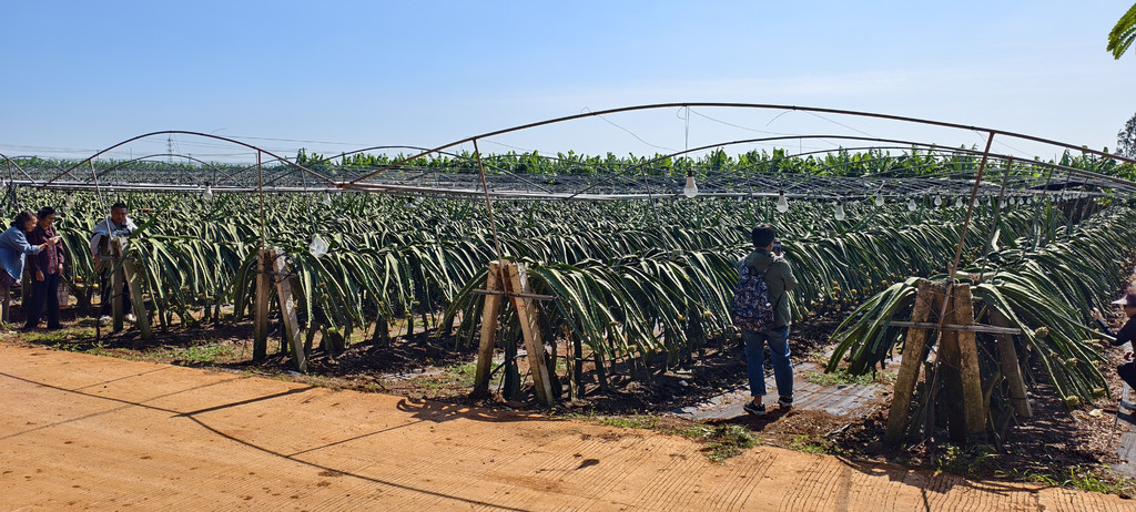 这上面吊满灯泡的一片片就是红色的火龙果,要24小时光照,那个费电就不用说了。