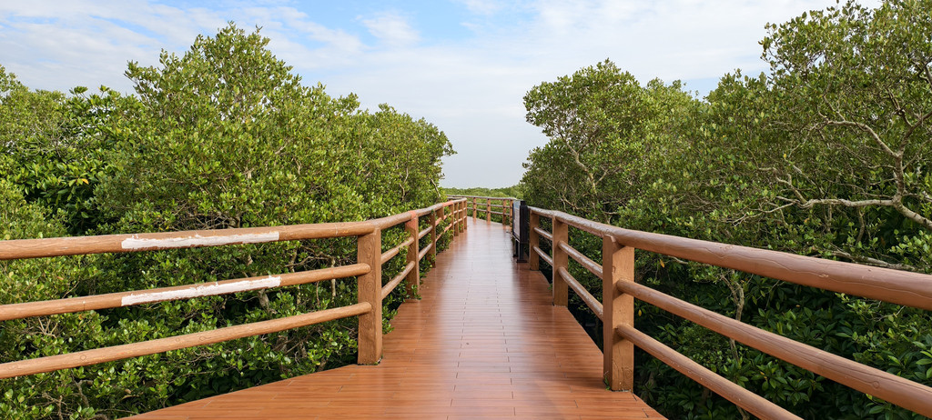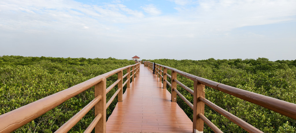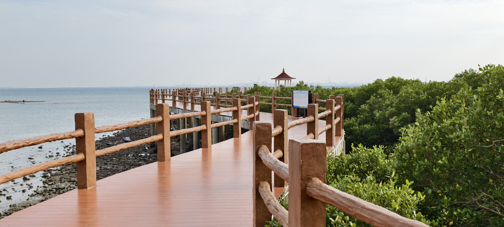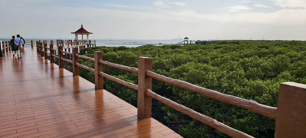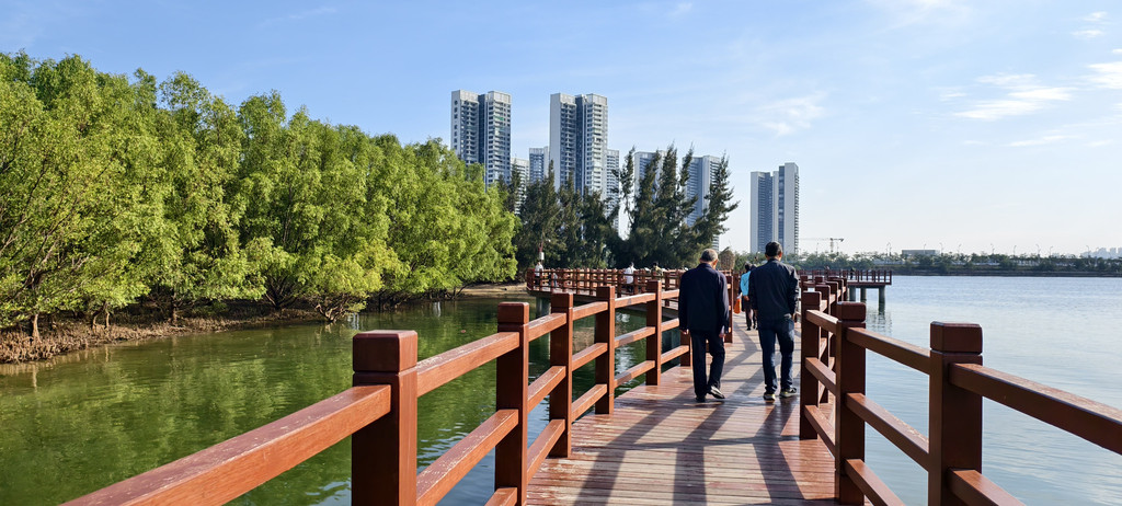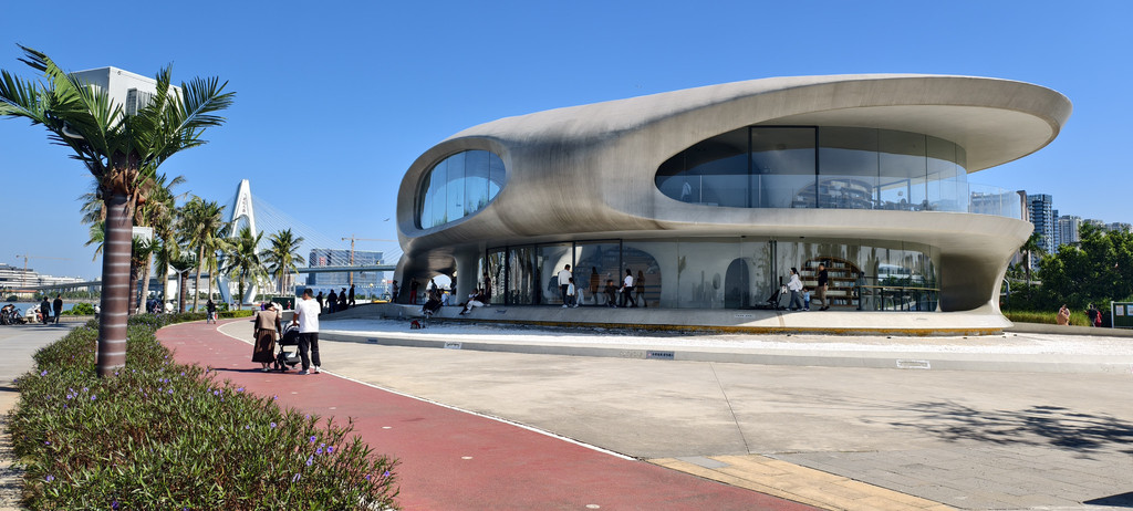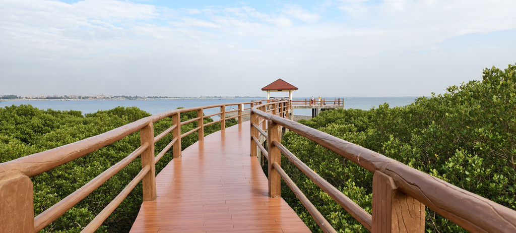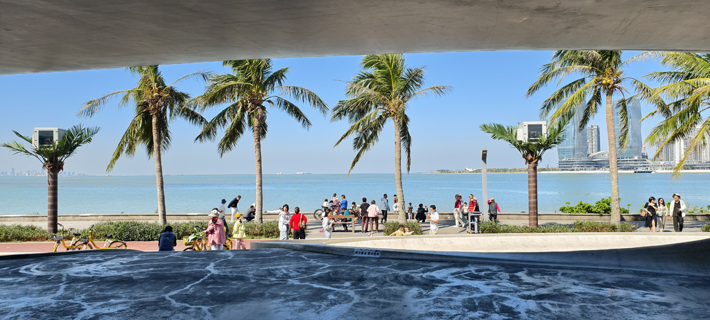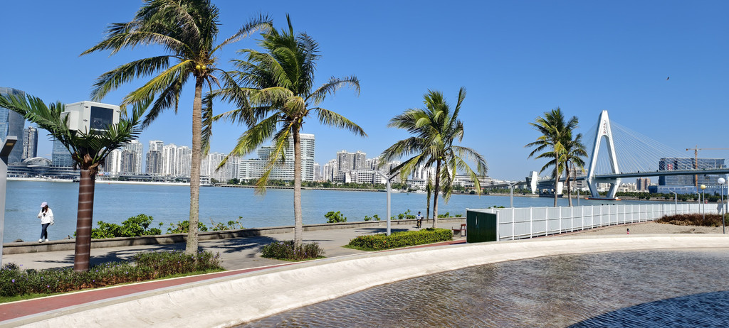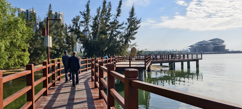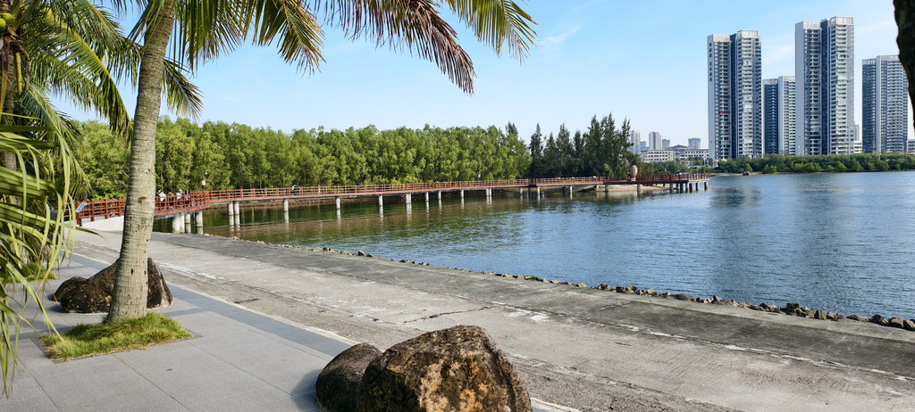 长廊是一条跨过海湾筑起的人行弯道,散布其中,一面是市景公园景,一面是一望无垠的海景。