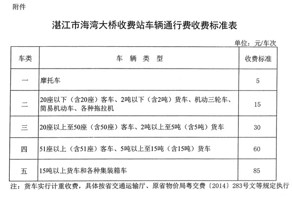 吐槽一件很奇葩的事,湛江作为广东这么一个发达省份的下属城市,海湾大桥连接坡头区和霞山区,霞山区是湛江市核心区块,坡头区虽然是经济开发区,但有南油基地和中国南海舰队;居然过这个桥要收费,下面给出的是单次收费价格表。{据说2027年会取消收费}