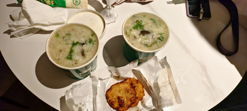 太晚了,点了两份外卖——皮蛋粥加虾饼。
