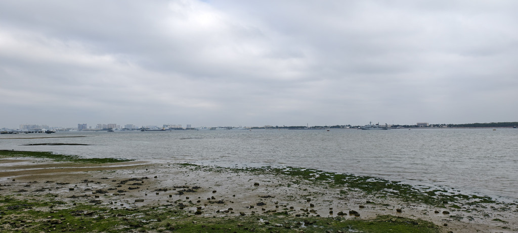 在轮渡上依稀可见远处的十里军港,停着不少南海军舰!