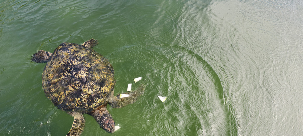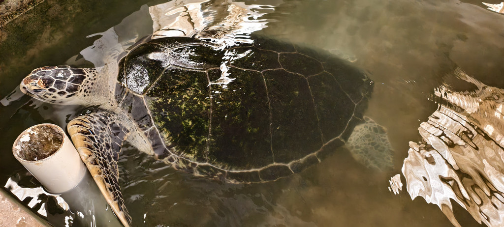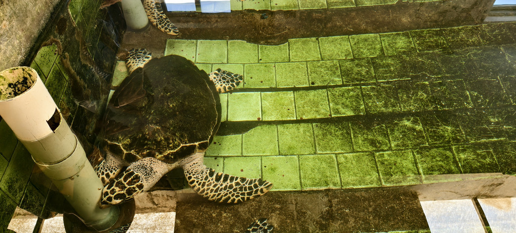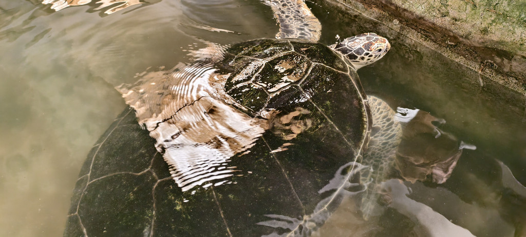 接着带我们来到了岛上的海龟城,其实就是一个人工海龟养殖场。在这儿看到了许多品种不同的大海龟,其中就有玳瑁。