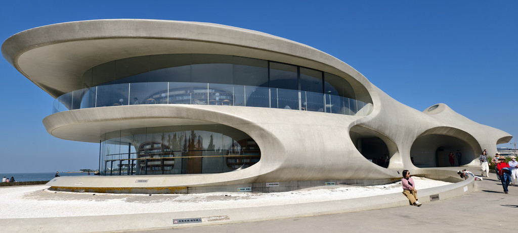 整个图书馆通体洁白,因海而生,临海而生,设计非常后现代,各种孔洞设计来源于设计师的初衷:每个小洞都是宇宙,也是一个个耳朵,倾听大海的精神世界。