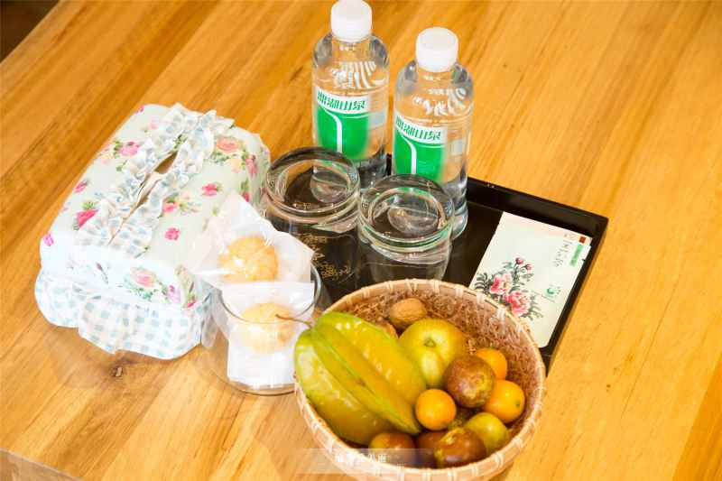 桌面上的欢迎水果由5种时令新鲜水果组成,旁边还有一罐手工制作曲奇,能感受到酒店主人满满的诚意。