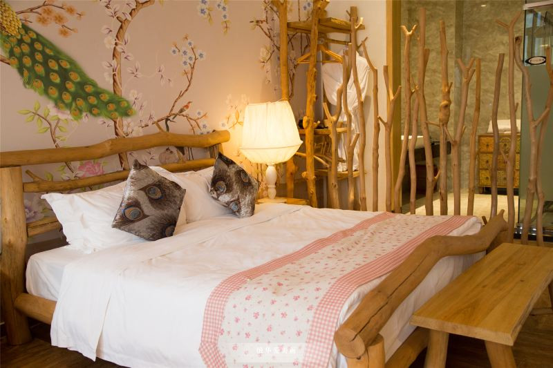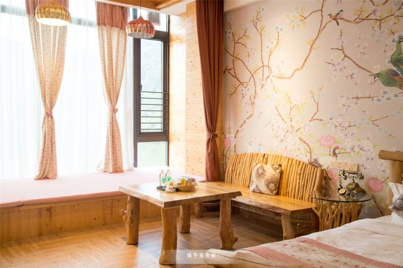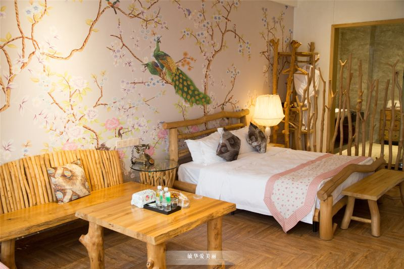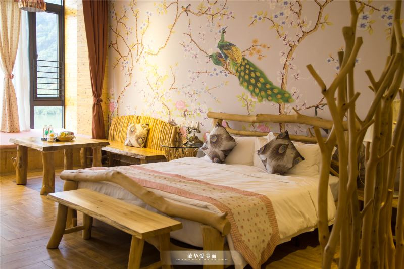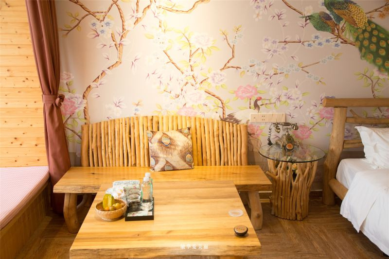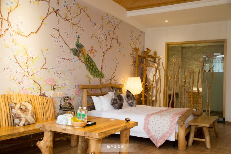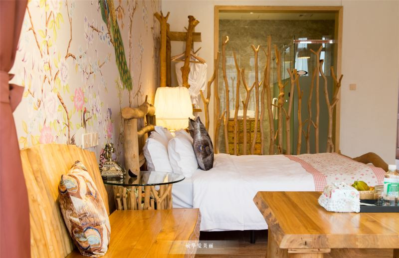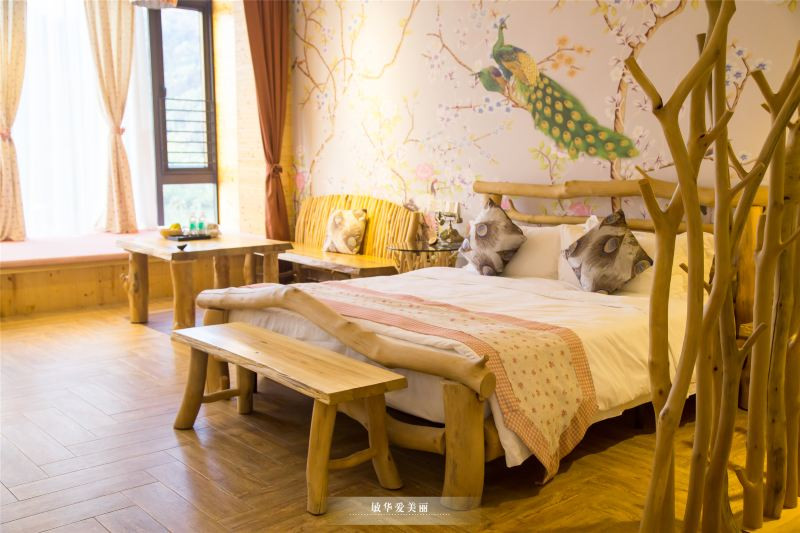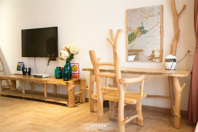 桌子、椅子、茶几、屏风、电视柜、衣柜整套都是枯木做成的,结合布艺装饰品与孔雀主题墙纸,衍生出别样的生机和美感。