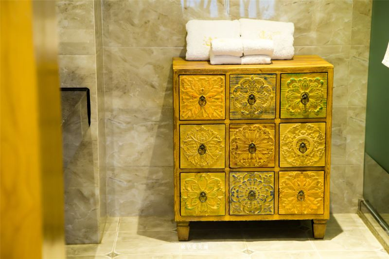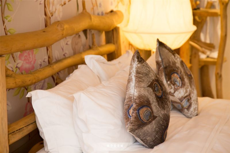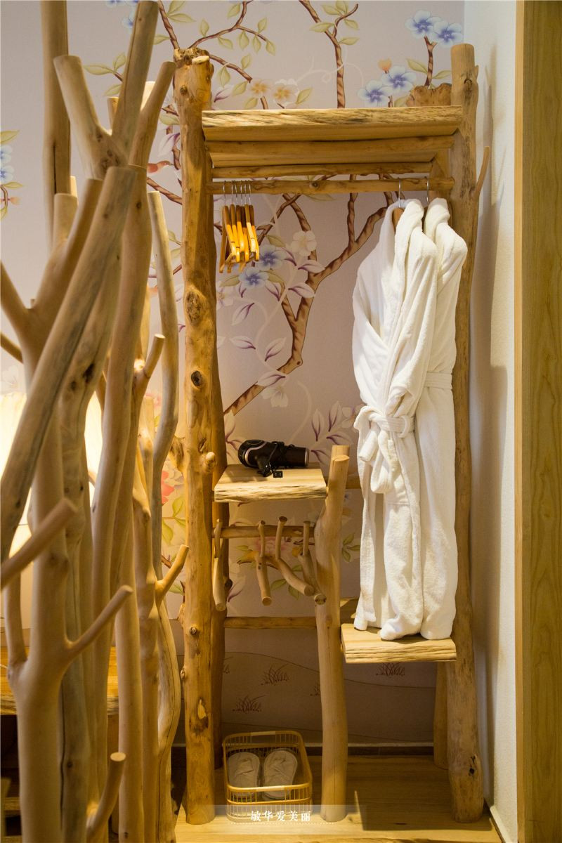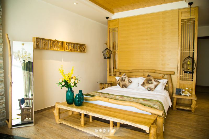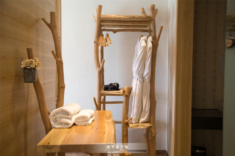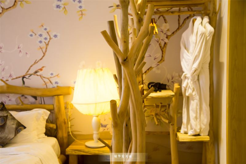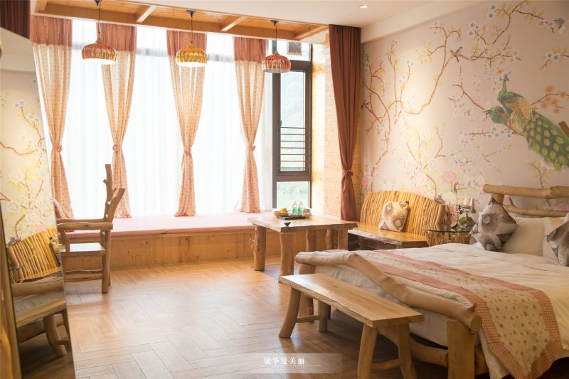 桌子、椅子、茶几、屏风、电视柜、衣柜整套都是枯木做成的,结合布艺装饰品与孔雀主题墙纸,衍生出别样的生机和美感。