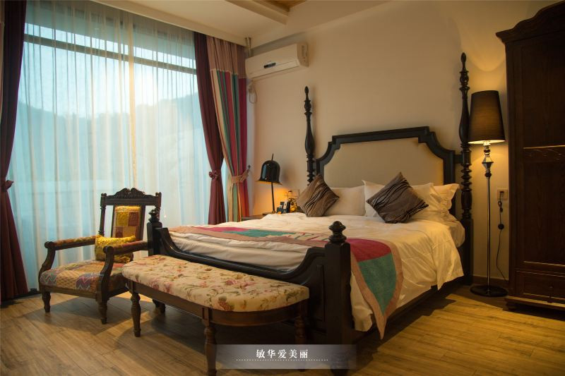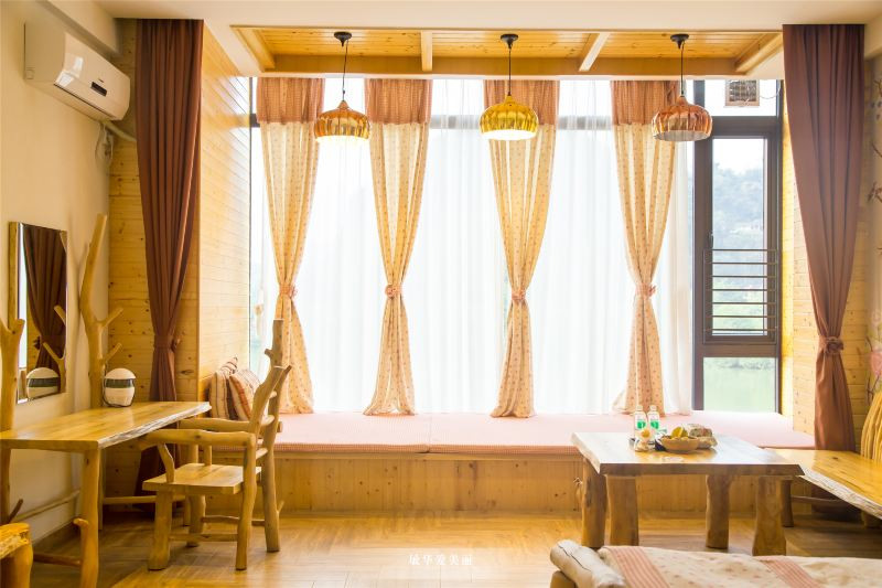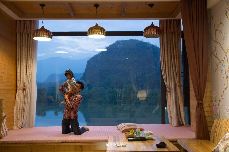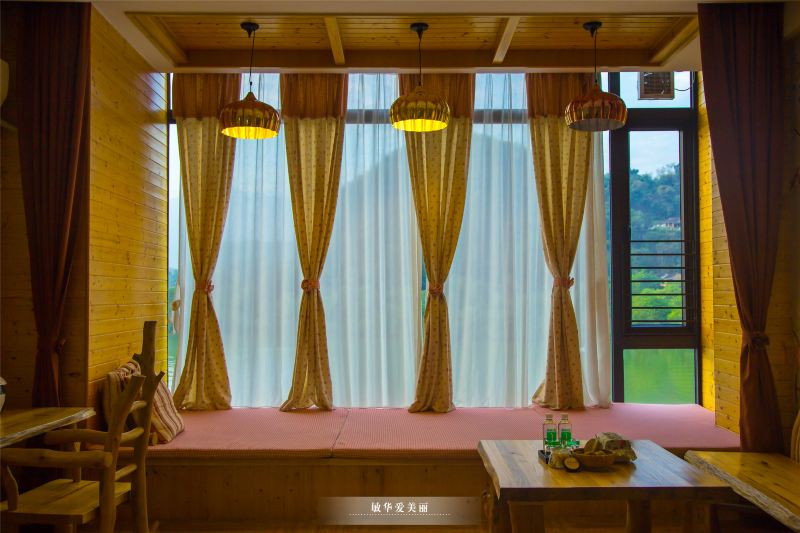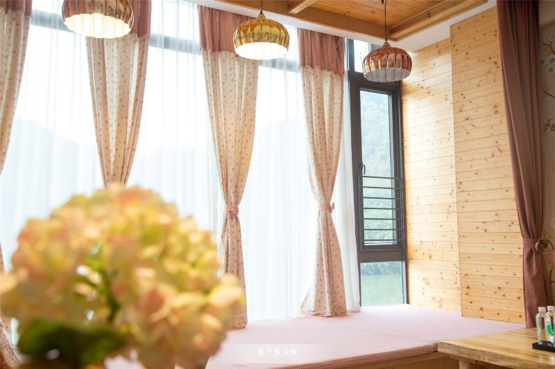 二楼的湖景房更富有浪漫色彩,偌大的飘窗,将窗外的山水景色全部都引到房间来,仿佛置身在湖畔上一样。