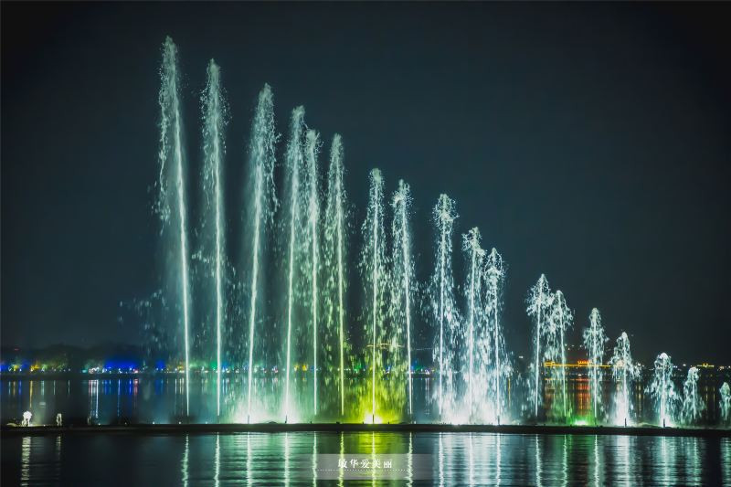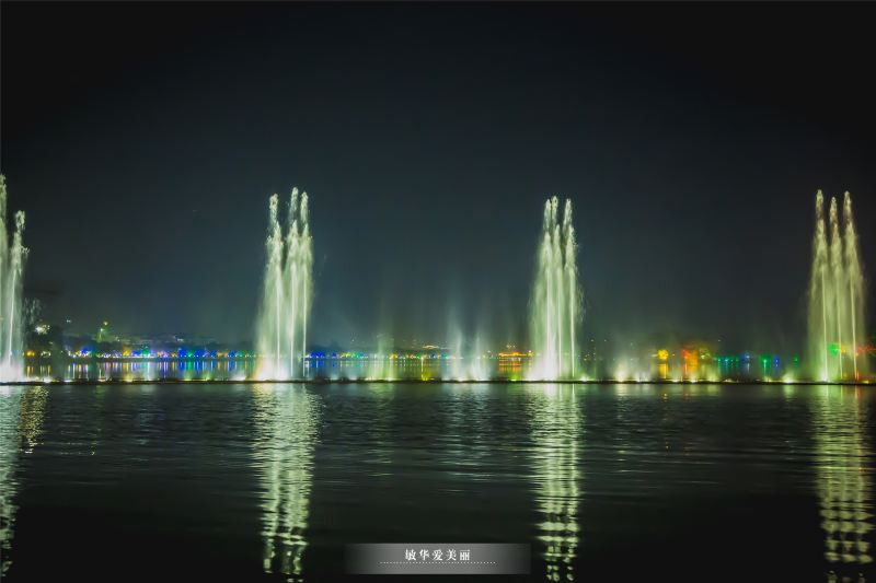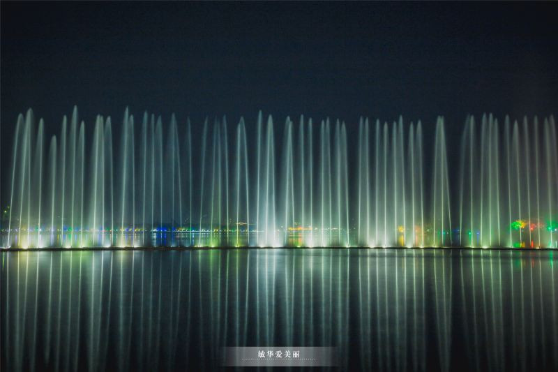 音乐喷泉支水柱整齐冲向天空,跟着音乐节奏的急缓起伏与高亢欢快,幻化成种种不同的形状,LED灯光配合下,精彩绝伦。