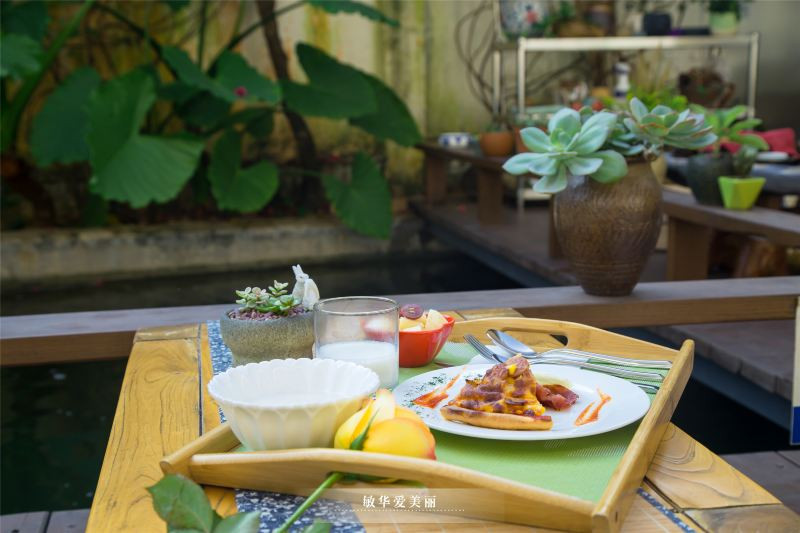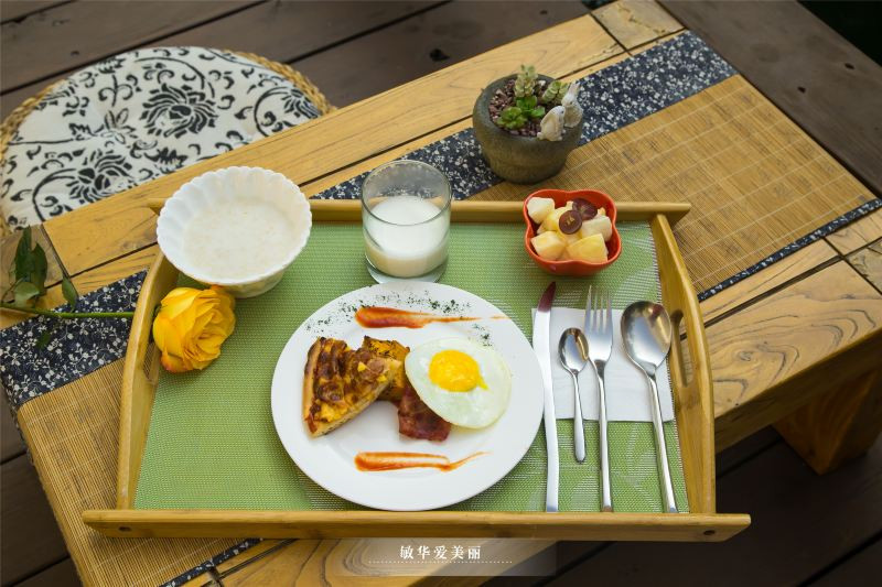 其实坐在户外鱼池旁的榻榻米上吃早餐也可以很写意,西式的早餐包括一碗麦片、一碟水果沙拉、一杯牛奶、一块PIZZA、一块烤南瓜、一只煎蛋以及一片培根。看似简单却营养均衡都照顾到,养胃又养心。