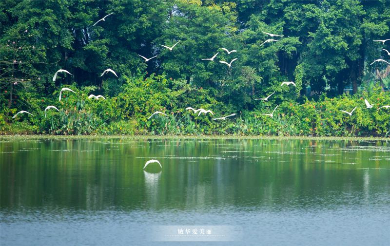 白色鹭鸟掠过湖面,打破了湖水的宁静。