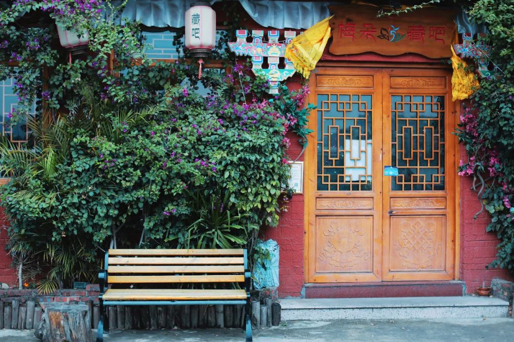 路边三角梅开得灿烂,一家家小店很适合闲逛,拍照都好看。漫步而行,湖水青绿,岩峰叠翠。