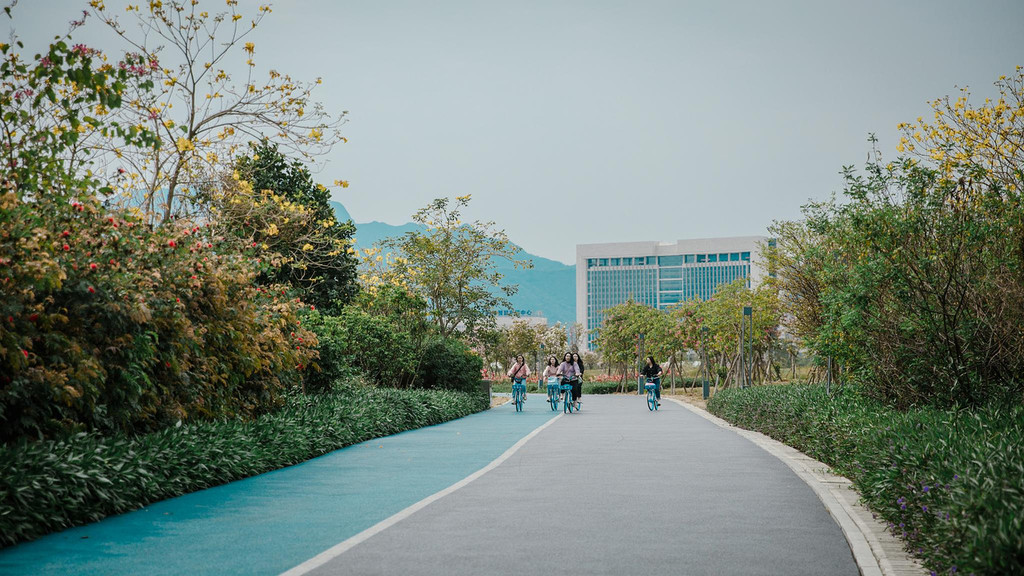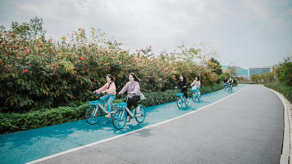 除了散步游览,在这里还可以选择骑行游赏。一辆辆蓝白两色搭配的单车,出现在砚阳湖公园里,在步道上行走,总会看到一群一群骑着自行车的人欢声笑语的从身旁飞驰而过,醒目的车身色彩成为与绿意盎然的公园组成了一幕幕靓丽的风景线。