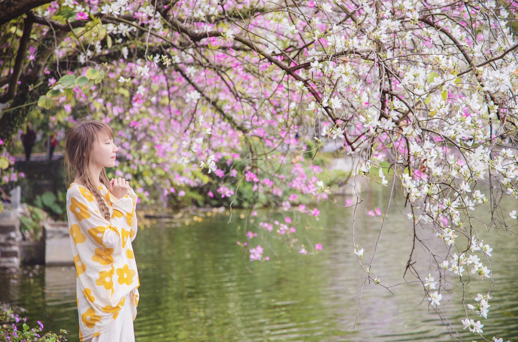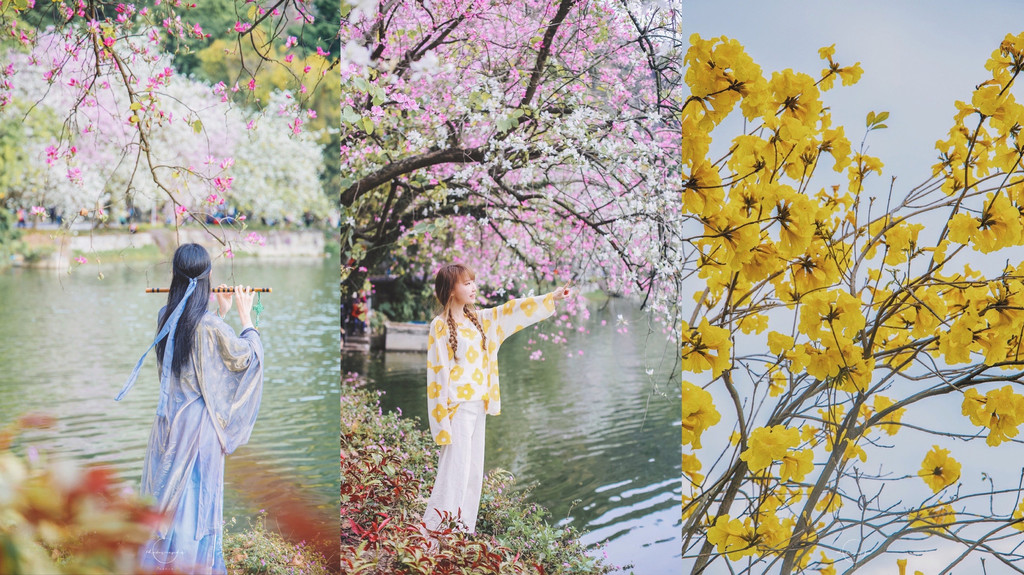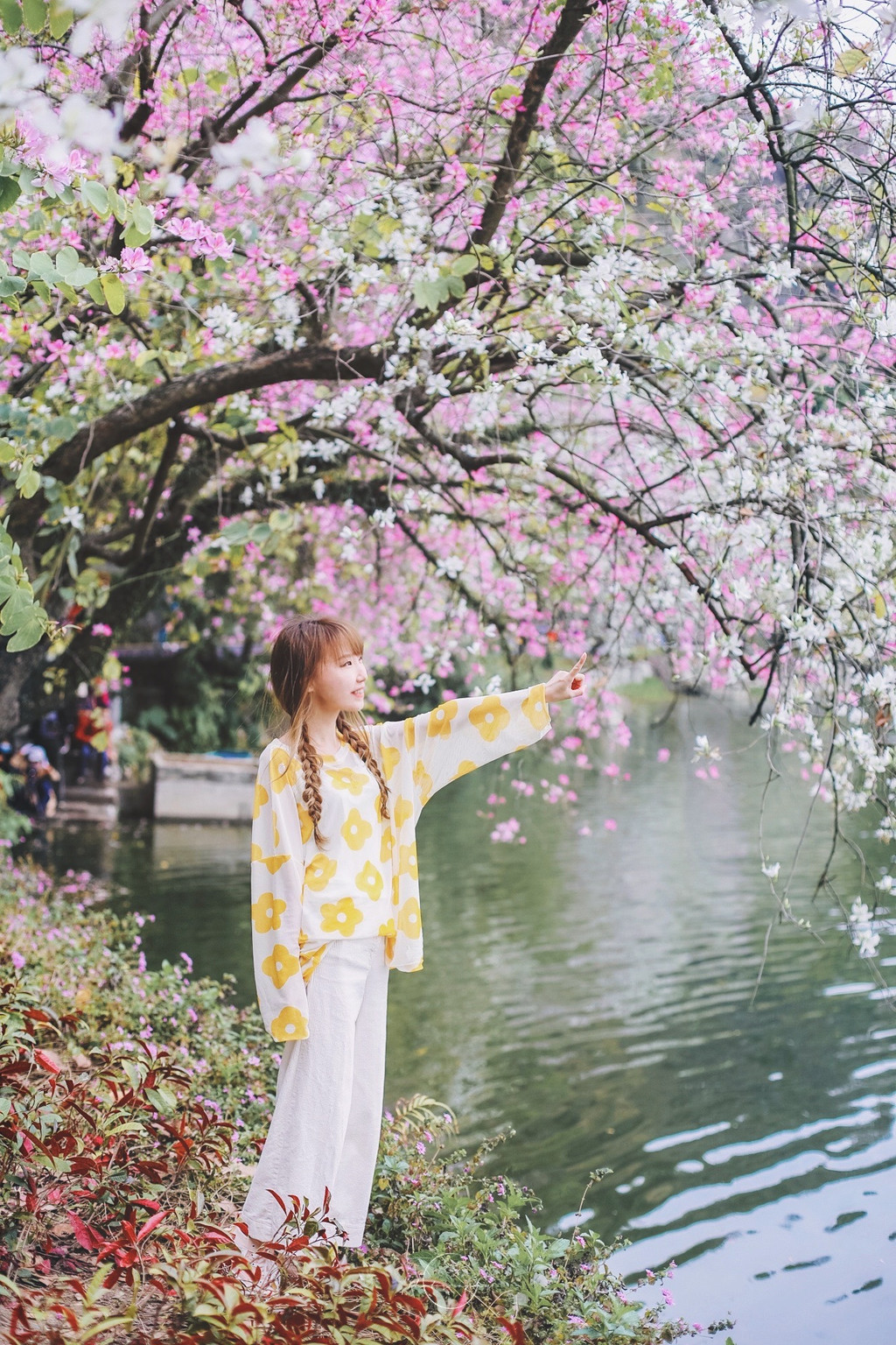 jQuery17107125452592886176_1615495384028湖边的粉紫荆花树下